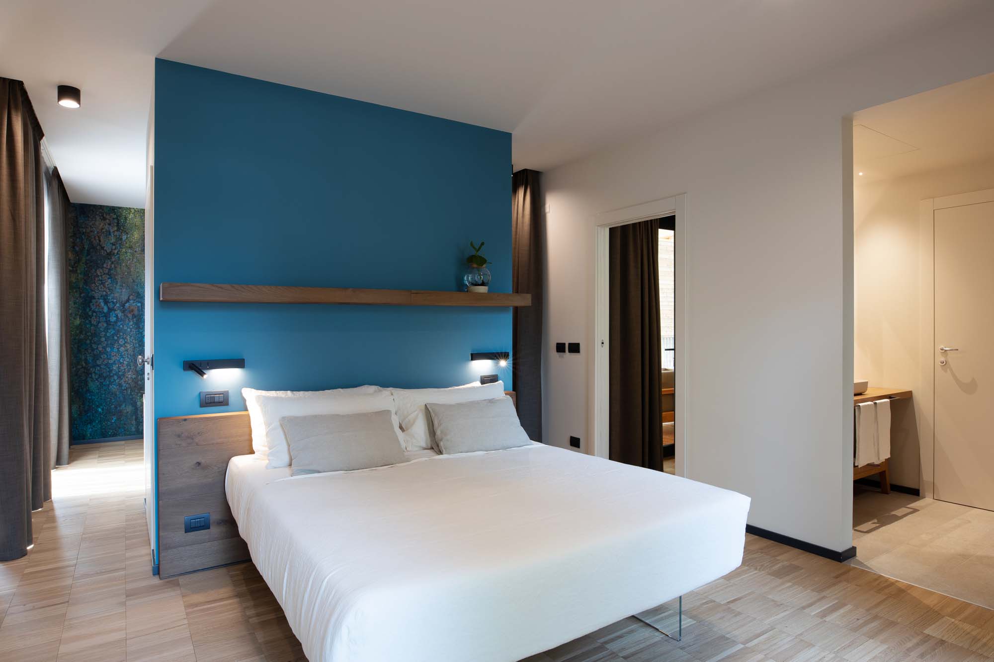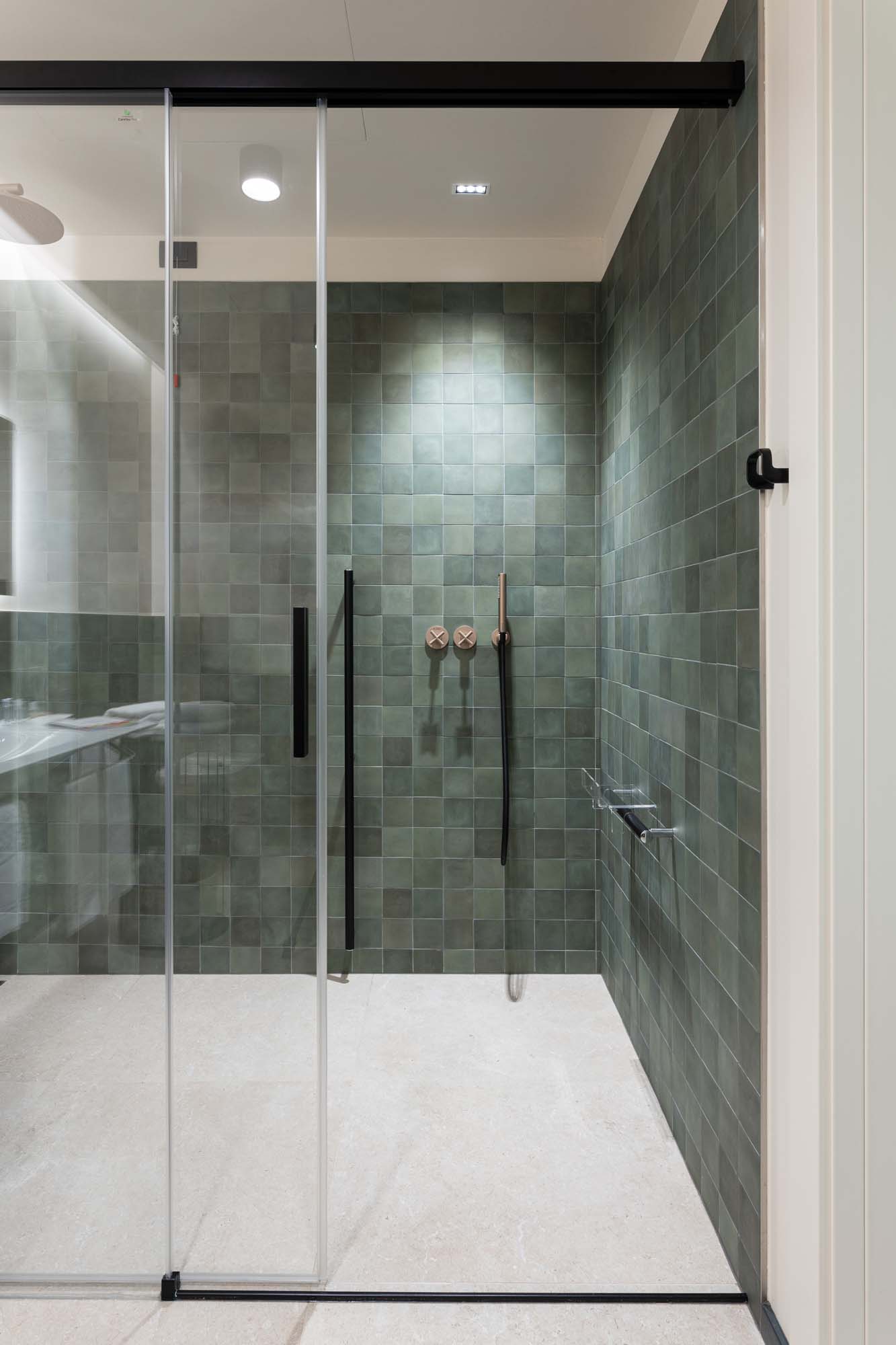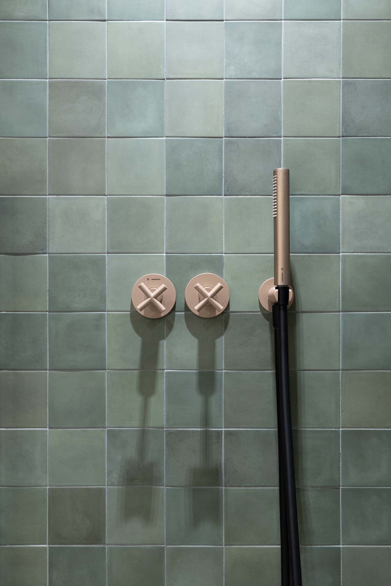 Los cuartos de baño de las habitaciones se han diseñado para brindar gran luminosidad y personalidad al ambiente mediante el uso de dos revestimientos distintos, ambos con gran fuerza expresiva y un efecto vibrante, elegidos entre las propuestas de la serie Crogiolo de formatos pequeños, que interpreta la sabiduría artesanal y la manualidad en clave contemporánea. La zona de la ducha se ha realizado con Crogiolo Zellige, pequeños ladrillos cuadrados que imitan la elaboración manual y se inspiran en la tradición norteafricana. Una característica distintiva de la colección consiste en los cambios de gradación, que, junto con la colocación aleatoria, crean un efecto blend de gran impacto. En cada habitación, la zona del lavabo se ha realizado con diferentes colores de Crogiolo Lume, ladrillos en formato de 6 × 24 cm con una atractiva estética contemporánea y un efecto superbrillante, que viste el ambiente con variaciones cromáticas y motivos de aspecto imperfecto y desgastado, capaces de hacer que los espacios vibren.