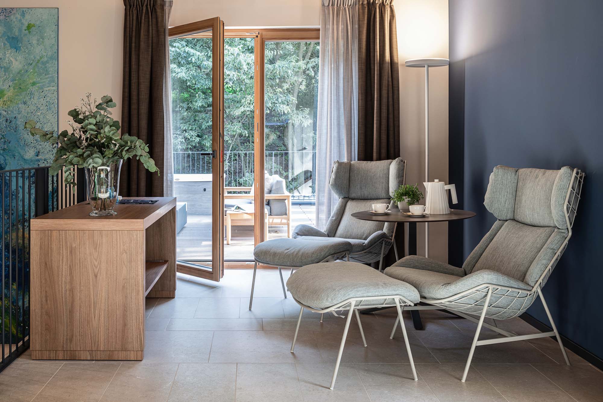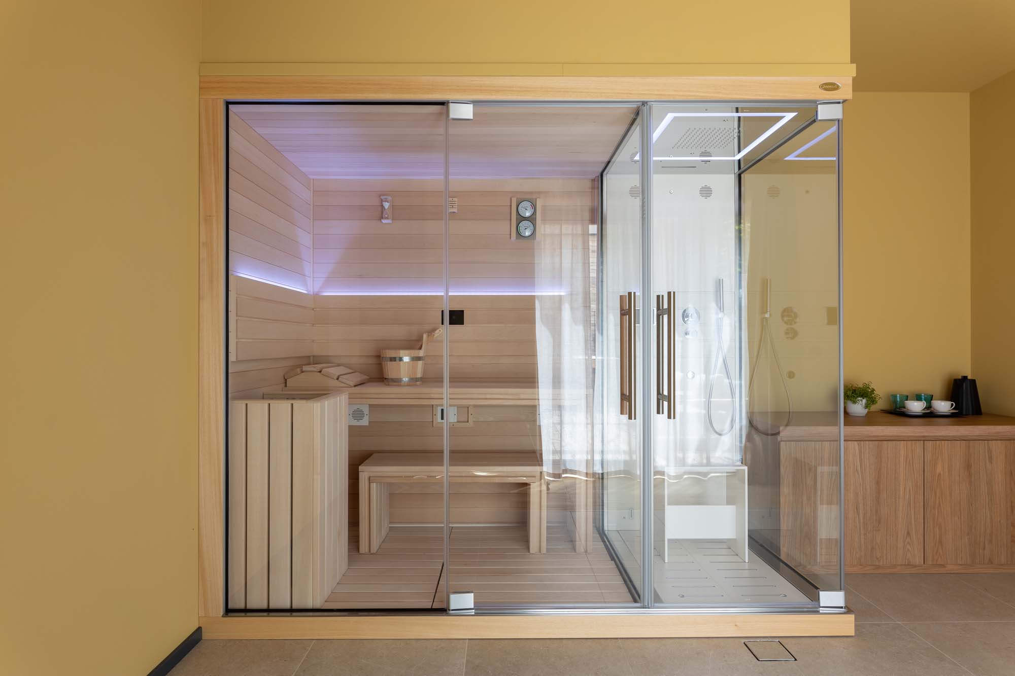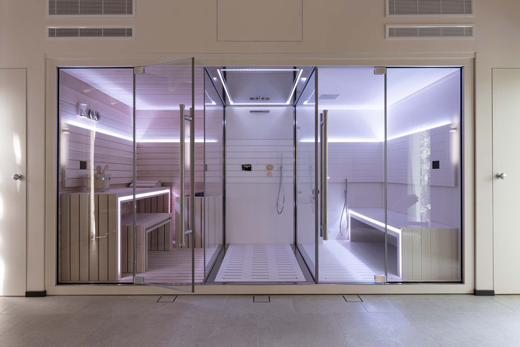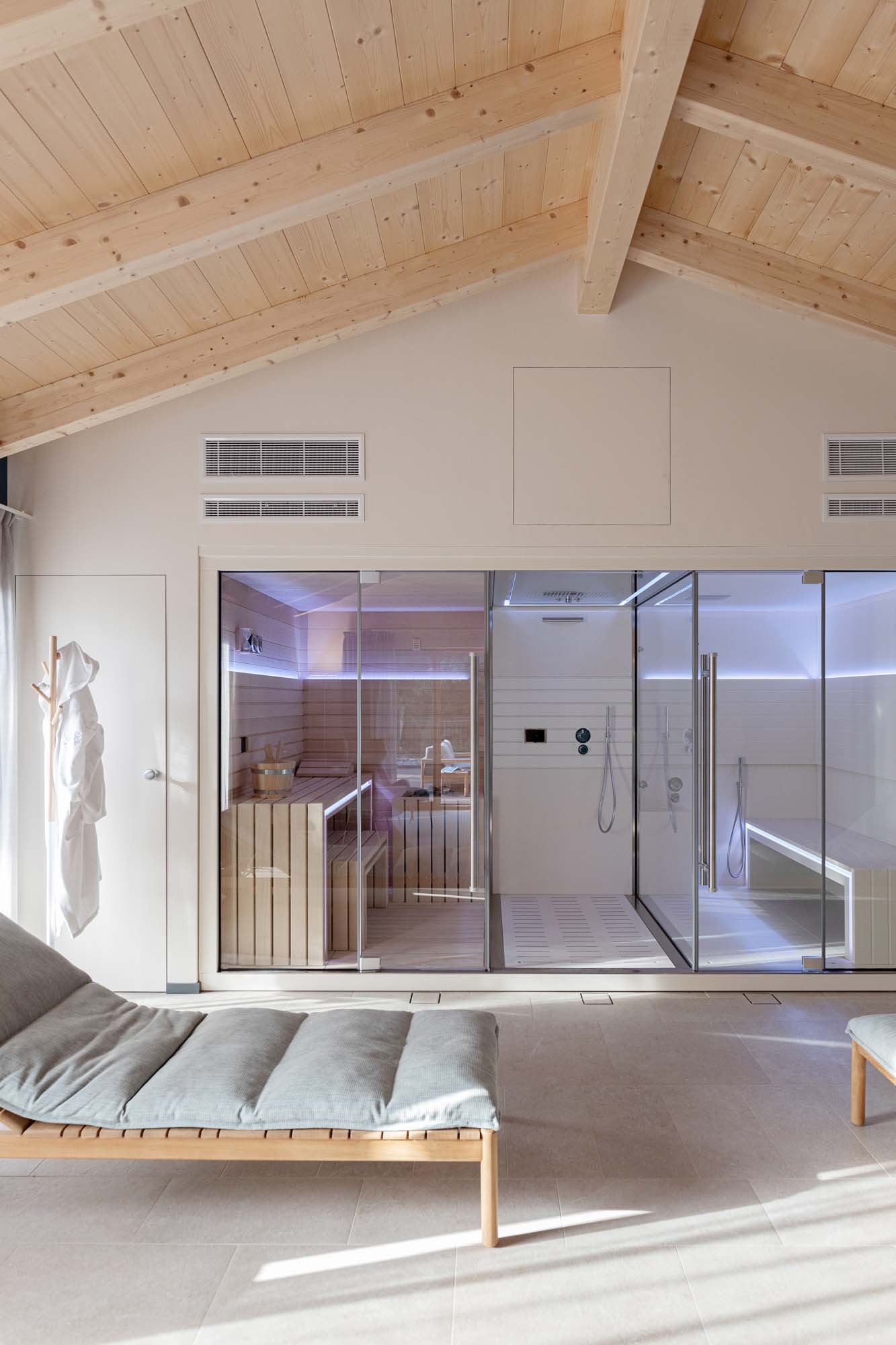 Se ha otorgado especial importancia a la zona spa, en la que se ha utilizado la colección Mystone Limestone Sand para el suelo y parte de los revestimientos de pared. Este gres porcelánico de tonalidad cálida y natural crea atmósferas relajantes y acogedoras, en perfecta sintonía con los elementos naturales entre los cuales están sumergidos los alojamientos. La colocación de los azulejos de gres porcelánico combina formatos diferentes para crear un ritmo visual dinámico y contemporáneo.