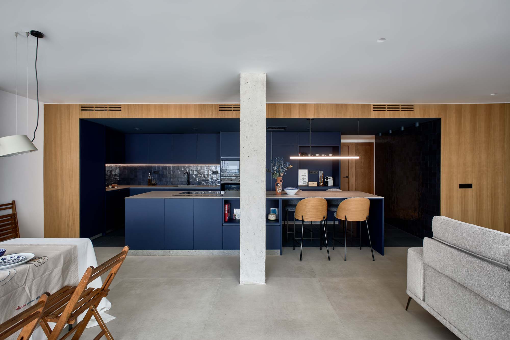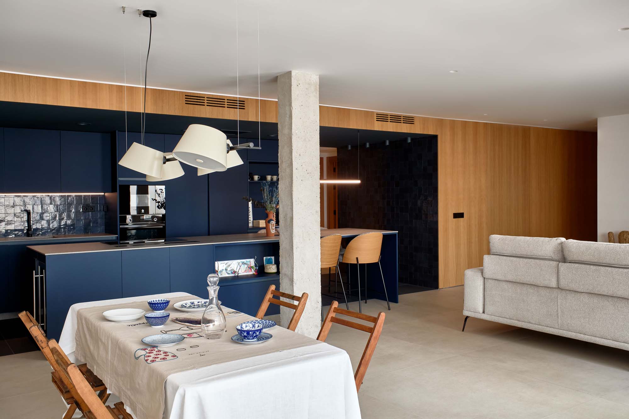 Una residencia en el corazón del puerto de Almerimar se presentaba como un apartamento fragmentado y poco conectado con el exterior. La intervención de JAO Arquitectura ha devuelto un nuevo sentido de apertura y fluidez, estableciendo un diálogo constante con el paisaje marítimo. Sobre una superficie de 178 m², la reorganización se articula alrededor de la llamada “veta”: una franja central que no solo estructura la distribución de los espacios, sino que alberga funciones fundamentales como cocina y baños, convirtiéndose en el eje identitario de la casa. Al norte y al sur de esta línea se sitúan dos macroáreas: la zona de día, abierta y polifuncional, orientada hacia las vistas del puerto, y la zona de noche, más recogida y privada, replanteada mediante materiales que proporcionan continuidad visual. La luz natural, potenciada por un proyecto de iluminación desarrollado junto con Grupo Seac, amplifica la percepción espacial, mientras que la elección de colores y acabados subraya el carácter unitario y sofisticado de la reforma.