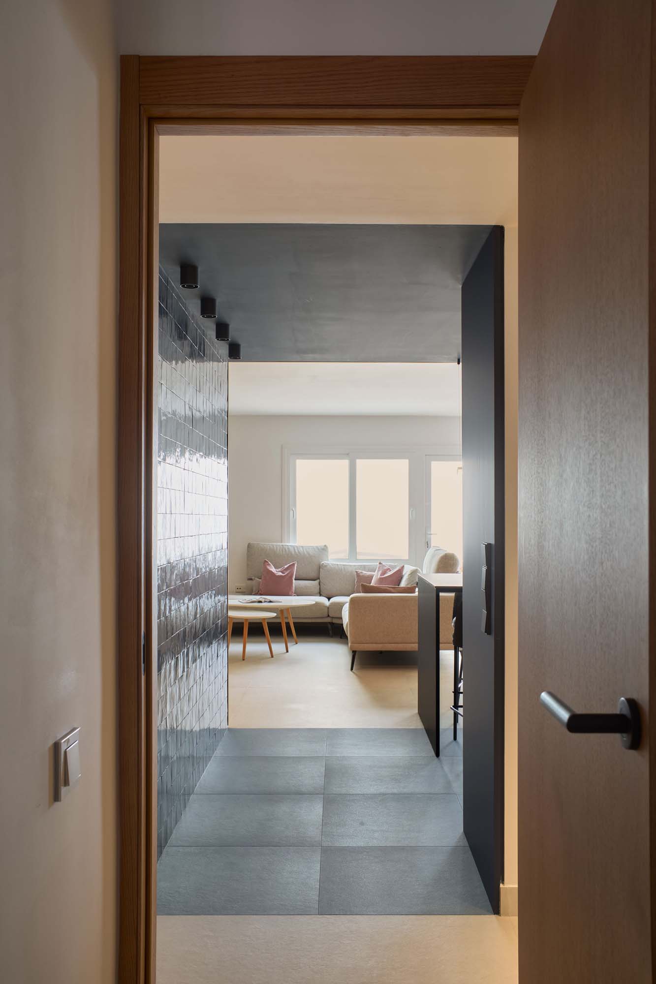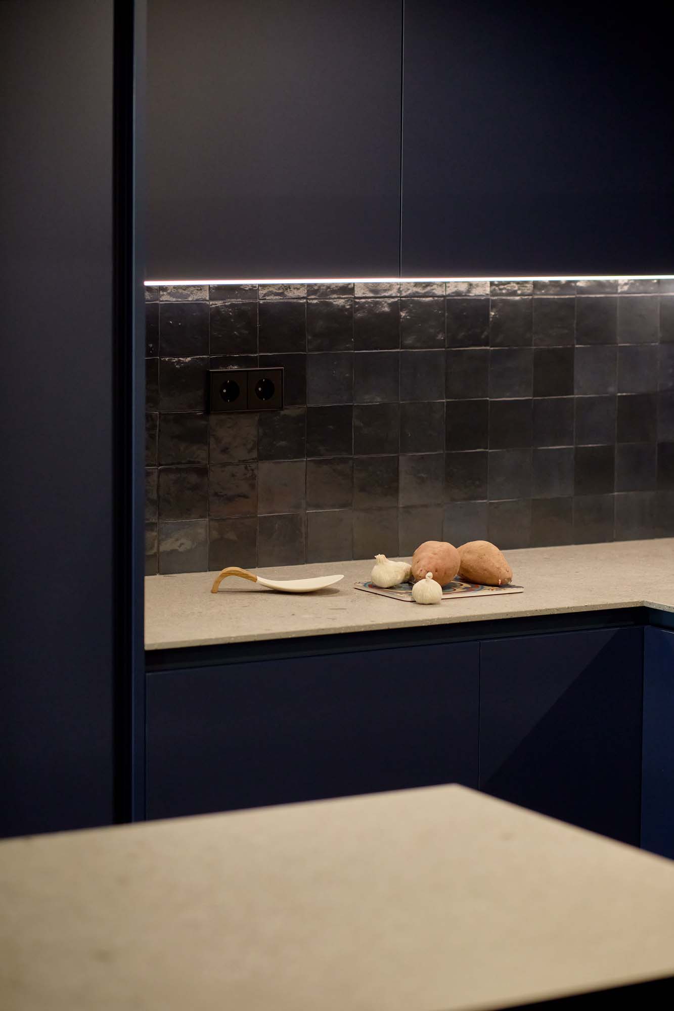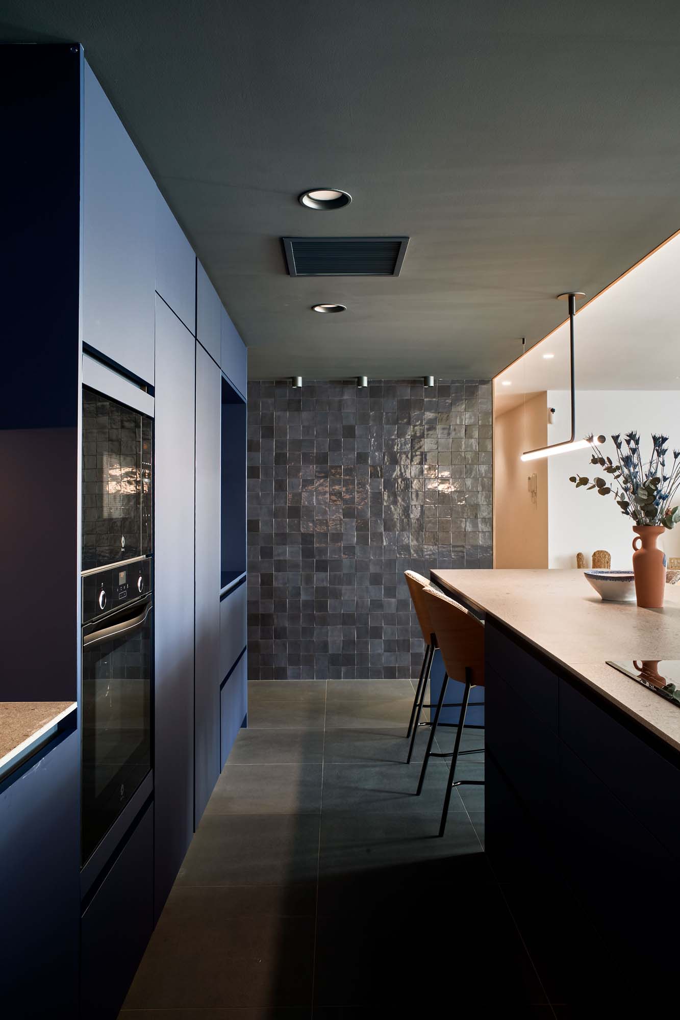 El suelo de toda la vivienda se ha ejecutado con la serie Cementum, en formatos de 120x120 cm, alternando el tono Ash en las zonas más neutras y el Indigo en la “veta”, en cocina y baños. Esta solución ha permitido mantener un diseño de colocación continuo, a pesar de la variación cromática, estableciendo un equilibrio entre la solidez de los tonos grises y la profundidad del azul, que remite al entorno marítimo circundante. Para los revestimientos verticales se adoptó la colección Zellige de la serie Crogiolo en el color China (10x10 cm), que con su superficie esmaltada introduce vibraciones luminosas y reflejos cambiantes, enriqueciendo la paleta monocromática con matices vivos y dinámicos.