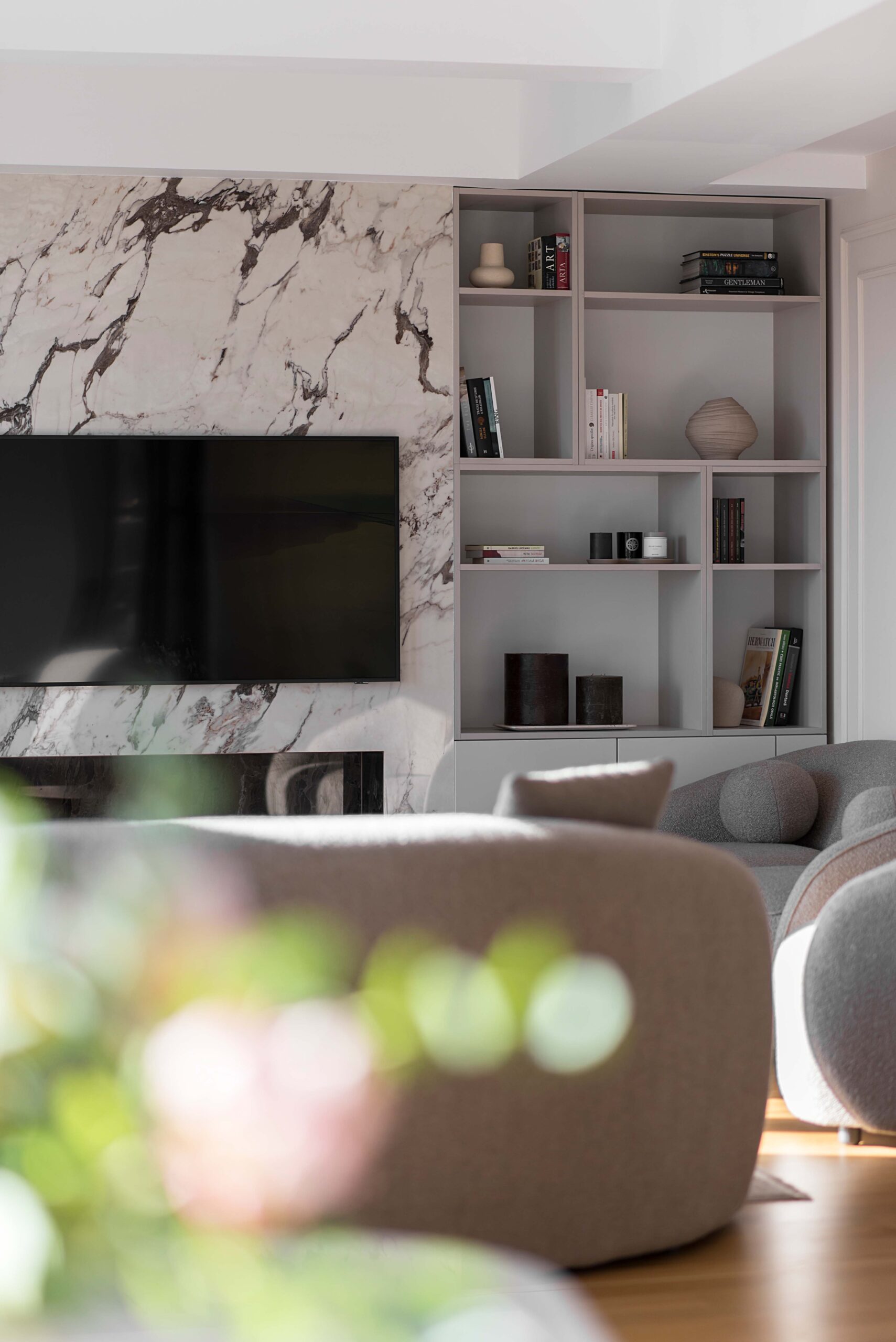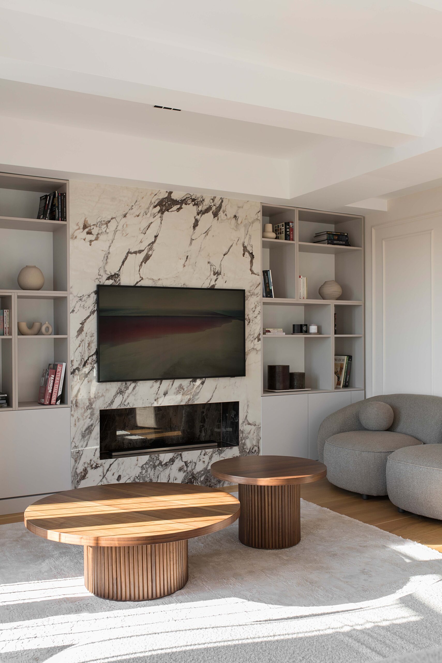 Para los revestimientos de la sala de estar se ha empleado The Top Marble Look Capraia, inspirado en el preciado mármol de Versilia, con base de marfil y vetas que van del color pizarra al bronce, de gran fuerza expresiva, en versión Lux, para incrementar, más si cabe, el efecto espacial de los volúmenes. La extraordinaria versatilidad del producto, además, ha permitido la utilización de The Top Marble Capraia para personalizar la encimera de la cocina, la mesa y la columna central: esta solución proyectiva hace que el espacio se vea más amplio, manteniendo elementos de continuidad estética entre las varias zonas del espacio abierto.