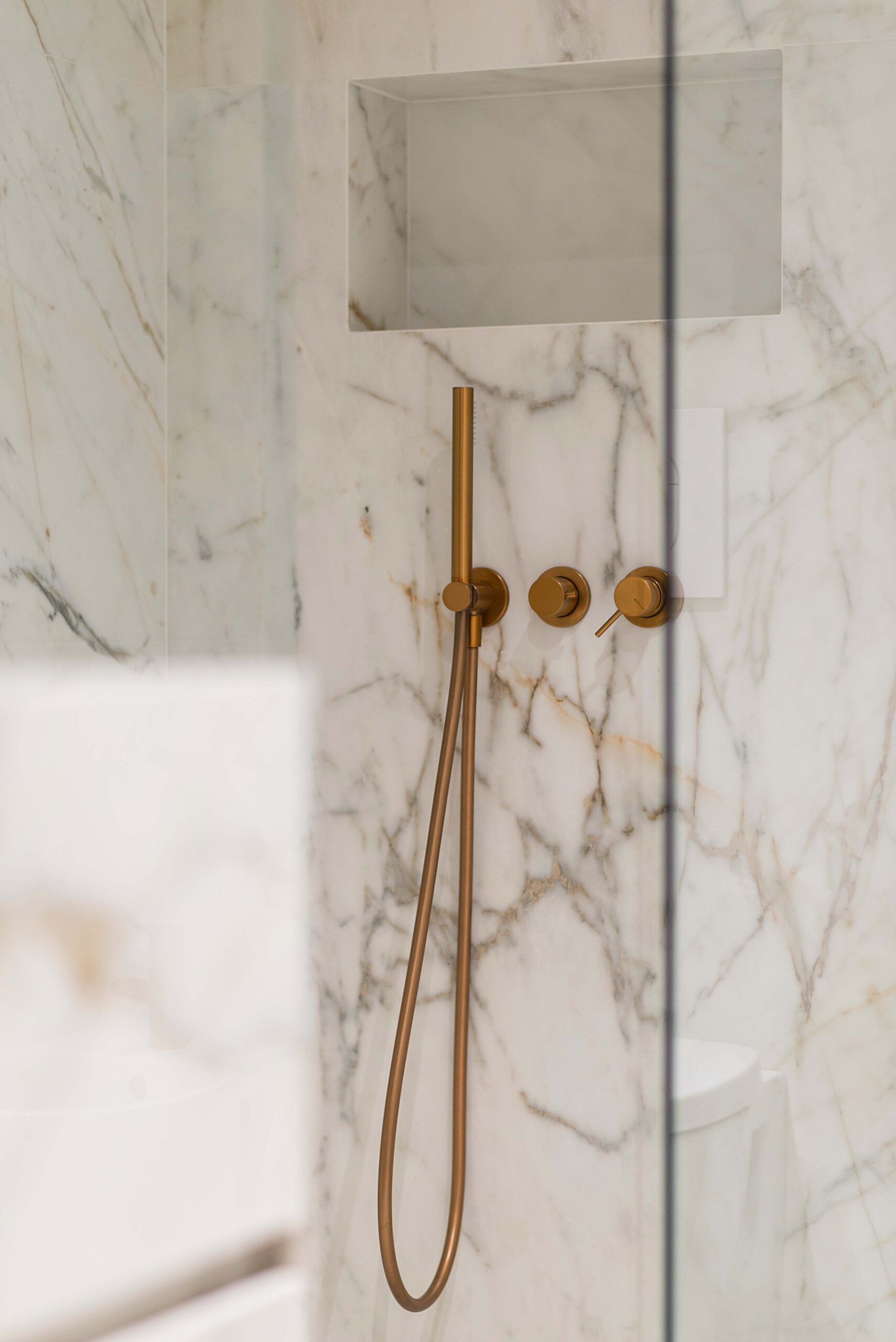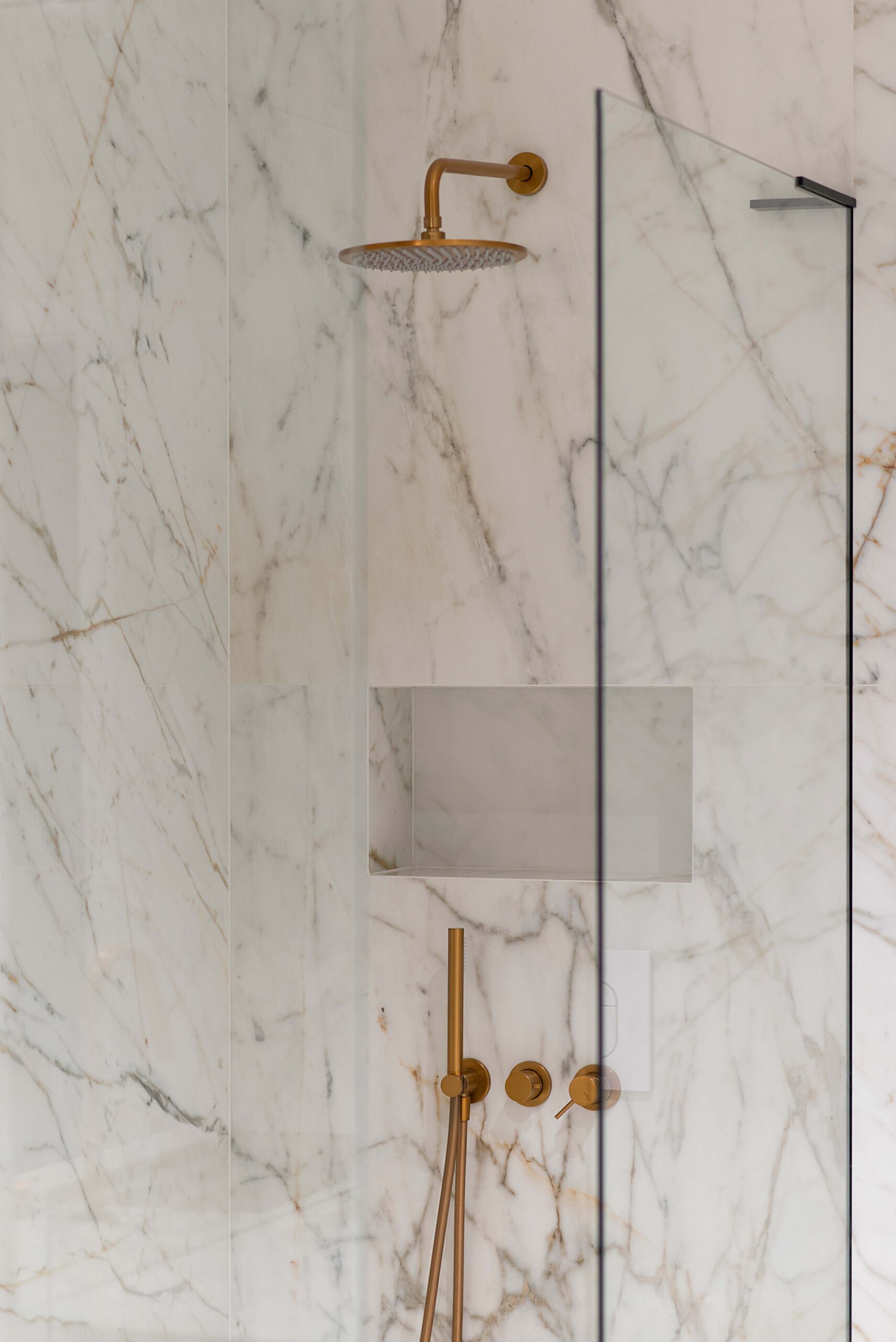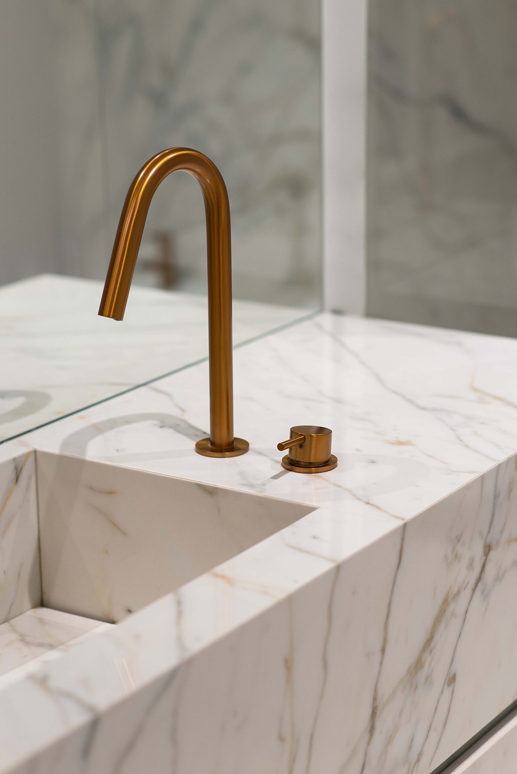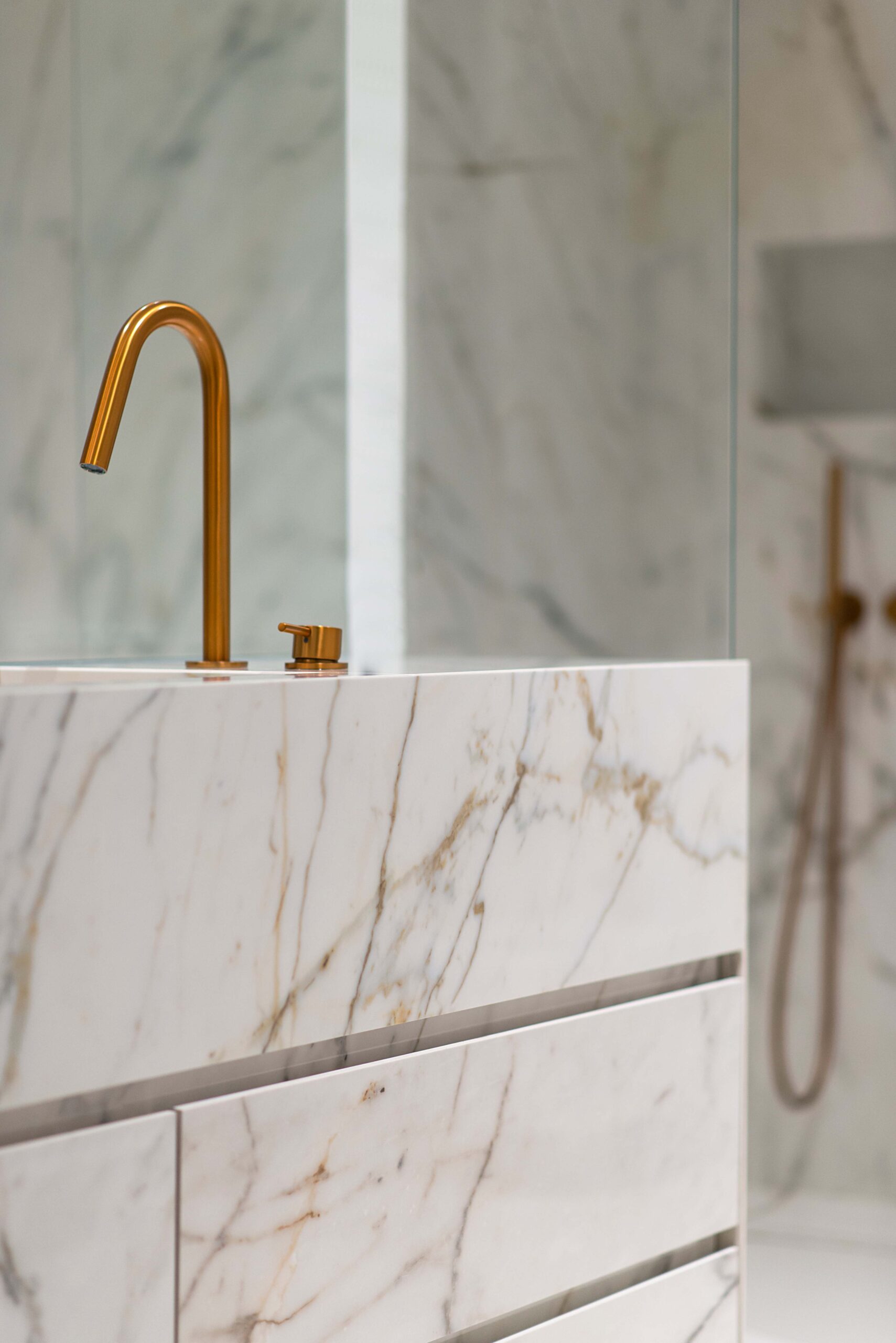 Las placas grandes de imitación del mármol también son el punto focal del baño. Aquí, al no poder contar con una iluminación natural importante como en la sala de estar, se ha utilizado el Golden White de Grande Marble Look, con vetas y tonalidades menos en contraste que las de Capraia: sobria y elegante, la versión Golden White en el formato de 120 x 278 cm se ha aplicado como revestimiento a las paredes y para realizar el gran lavabo de líneas rectas que constituye el punto focal del baño.