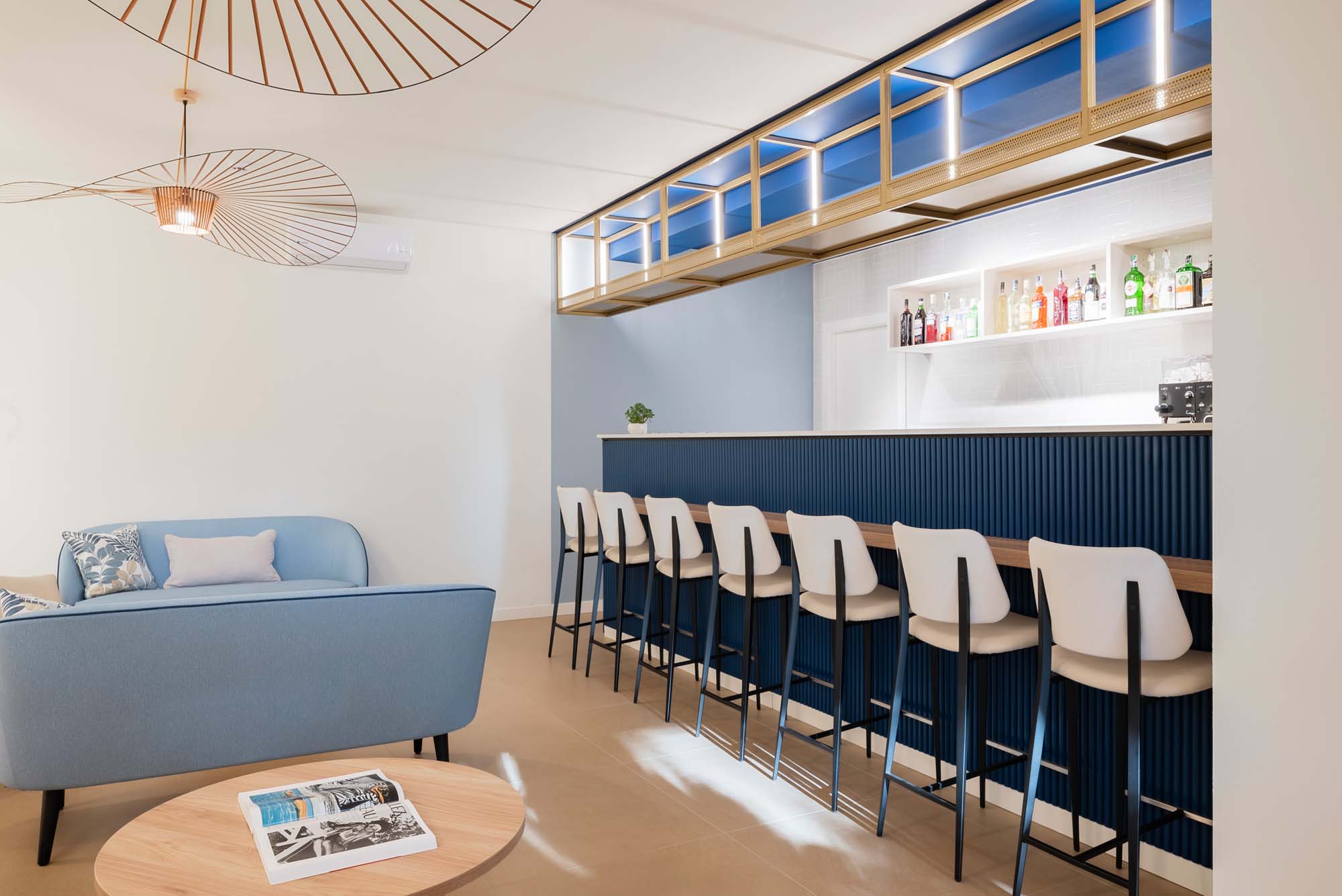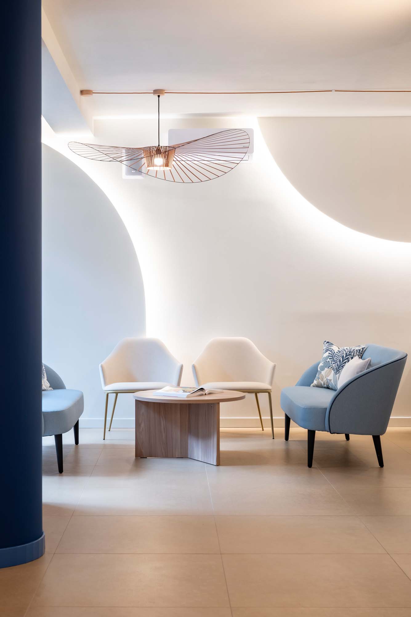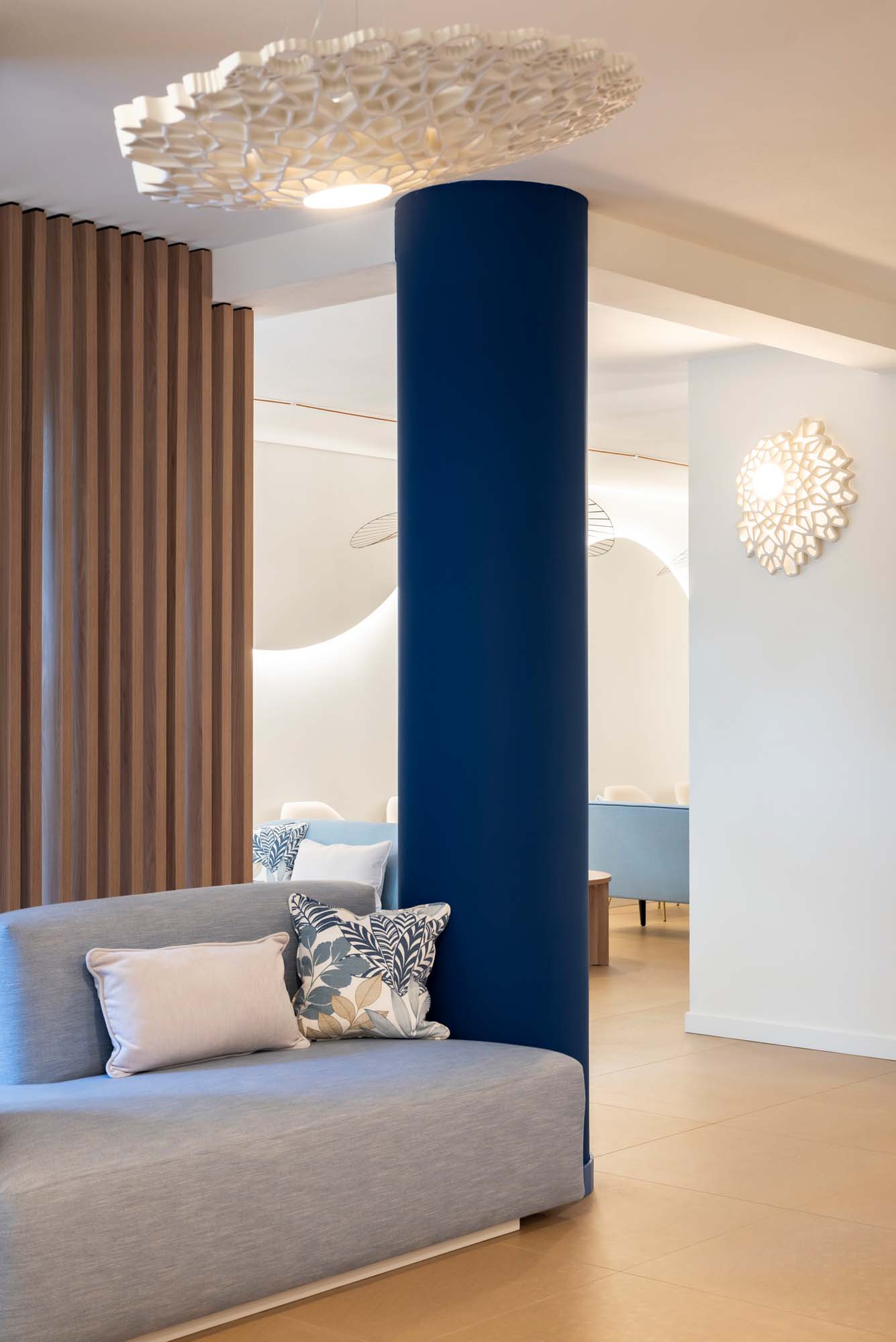 La llamada del mar, de la arena y de las olas es el hilo conductor del Tuscany Hotel Alle Dune en Castagneto Carducci (Livorno), diseñado por el Hub 48 Studio de Bonfante Interior Contractor. El objetivo era recrear en el interior la sensación de estar inmerso en el litoral toscano. “No se trata de ambientes temáticos”, comenta Sofia Bonvicini, diseñadora de interiores de Hub 48, “sino de representaciones conceptuales de los elementos marinos, como el suelo en espiga blanco y azul de las habitaciones que, de forma geométrica, recuerda a las olas del mar, los tonos de la madera que evocan el color de la arena y el blanco que refleja la luz.”