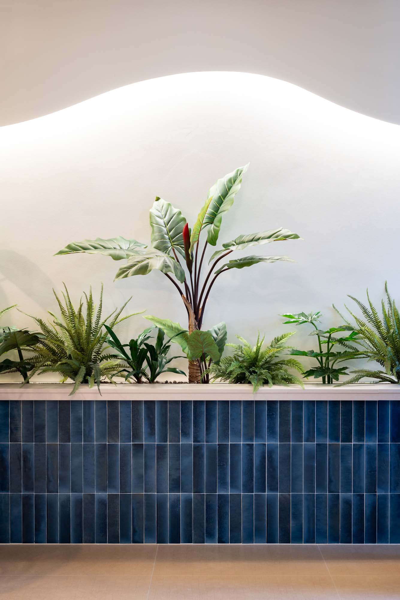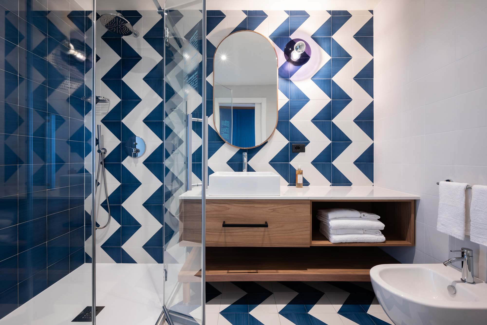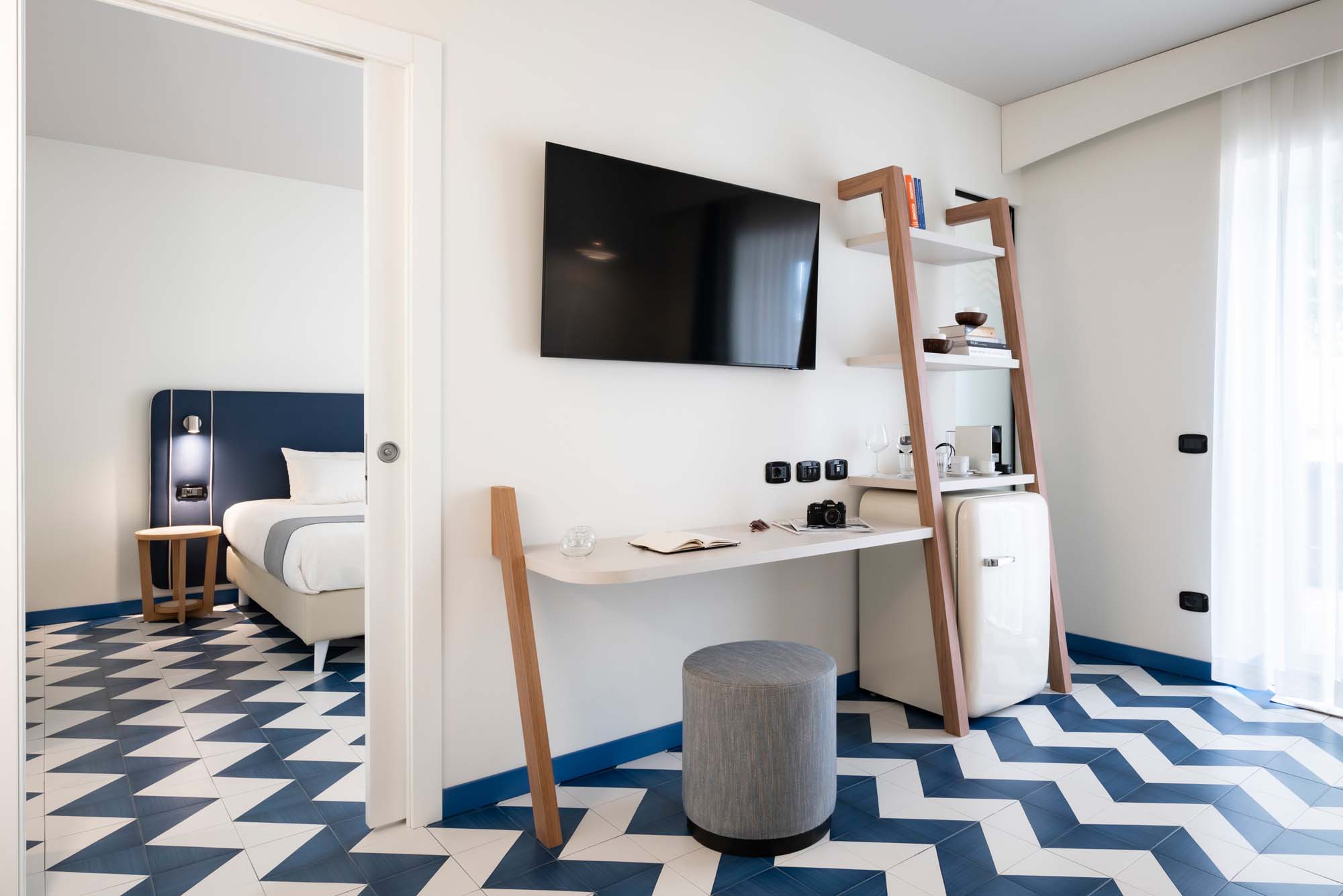 En los interiores del hotel se hizo un amplio uso de la cerámica. “Necesitábamos productos frescos y con textura, con contrastes brillantes, colores vivos y mil matices, que parecieran esmaltados a mano y que permitieran jugar con la colocación. La cerámica fue la herramienta clave para interpretar el concepto.” Hub 48 eligió la colección de gres porcelánico Slow inspirada en el barro tradicional en el decorado Rafia (formato 120x120 cm), cuya decoración en bajorrelieve sobre la materia cerámica enriqueció con motivos gráficos y contrastes refinados el suelo del vestíbulo y del bar, así como el revestimiento de los baños y otros espacios comunes. Esta textura es posible gracias a la Tecnología Premium 3D Ink de Marazzi, que confiere un extraordinario realismo matérico gracias a la perfecta correspondencia entre los gráficos y la estructura superficial. La serie Crogiolo Scenario, que retoma las mayólicas típicas de los contextos mediterráneos (formato 20x20 cm), se utilizó en colocación en espiga en los suelos de las habitaciones y como revestimiento en los baños de las mismas. Los azulejos de pequeño formato con esmalte superbrillante de la colección Crogiolo Lume se utilizaron para realzar la pared del bar, en una colocación especial en cesta, y también aparecen como revestimiento del mueble-jardinera en la entrada, demostrando la flexibilidad de uso del material.