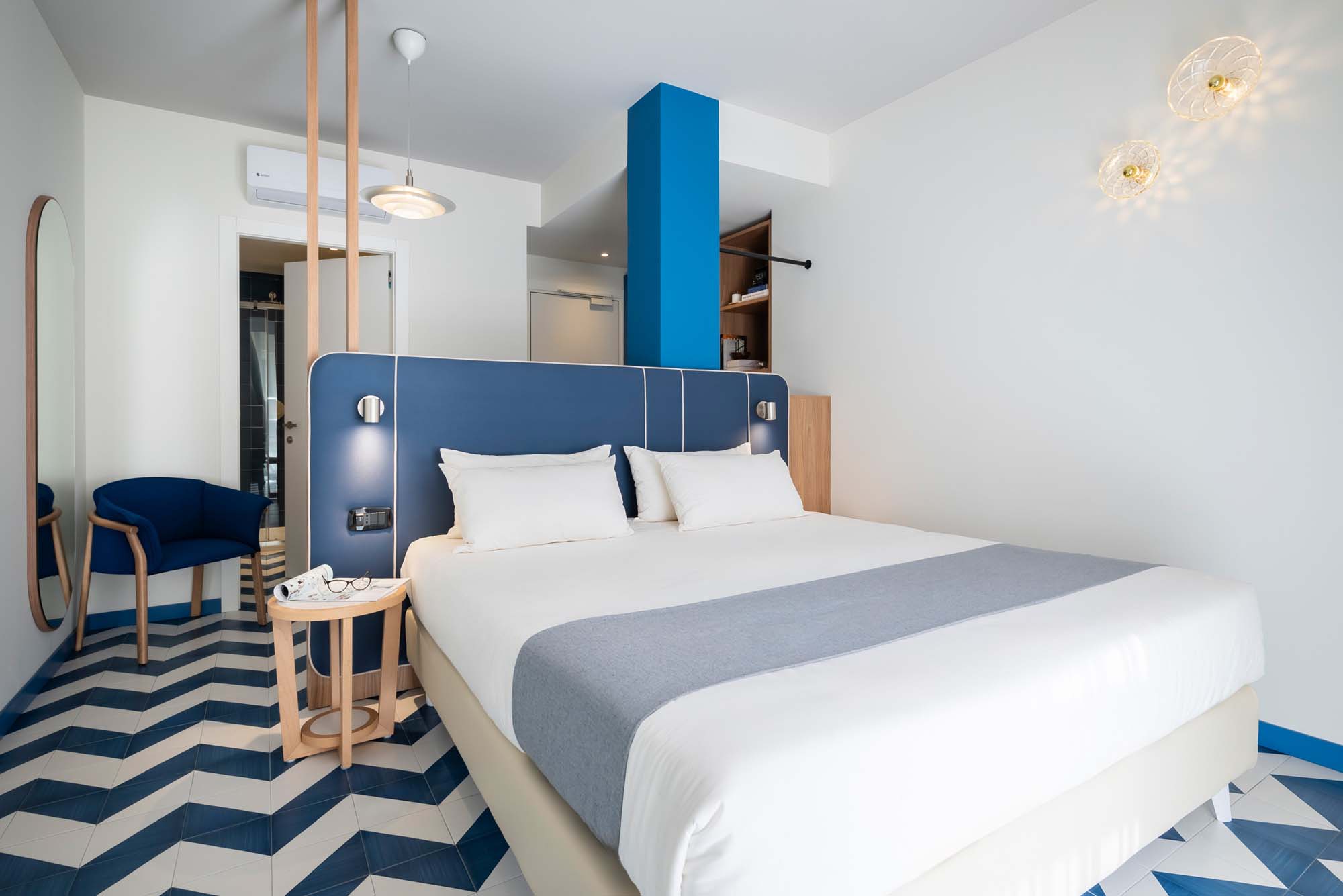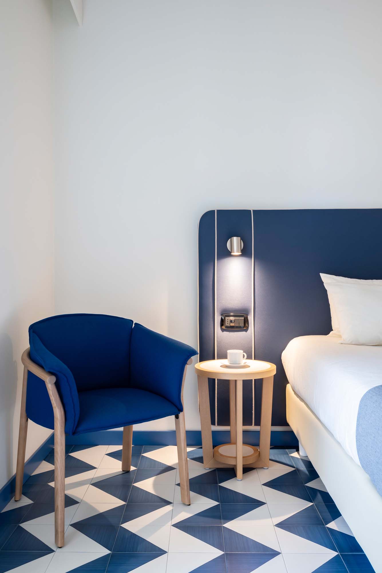 Los espacios, desde el vestíbulo hasta las habitaciones, son de dimensiones contenidas pero funcionales: “Antes de desarrollar el concepto”, continúa Bonvicini, “partimos del análisis de los espacios existentes, redistribuyendo los volúmenes, demoliendo y reconstruyendo particiones para optimizar los ambientes. En el vestíbulo estudiamos los flujos y las funciones para definir las áreas operativas (bar y recepción), tratando de valorizar los elementos estructurales: por ejemplo, insertamos bancos entre los pilares o mesitas en el pasillo: elementos funcionales que se vuelven estéticos. En las habitaciones intentamos ampliar los baños, especialmente las duchas y las superficies de apoyo de los lavabos.”