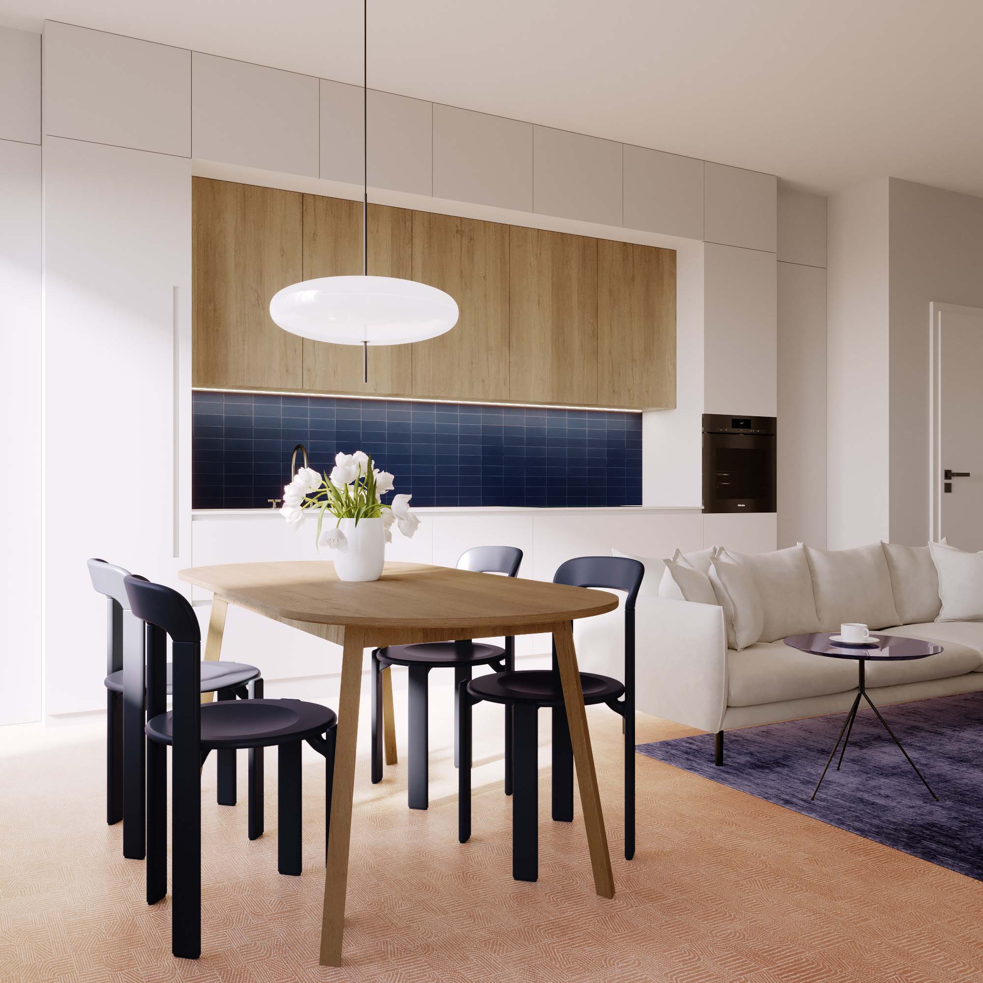 El pavimento unifica el salón y la cocina con la colección en gres porcelánico Slow, en el Decoro Rafia Cotto formato 75x75 cm. «Hemos elegido la colección Slow para el pavimento porque queríamos un material que evocara la tradición mediterránea, pero con un lenguaje moderno y versátil», explican los proyectistas. El decoro Rafia se distingue como una refinada reinterpretación contemporánea de las tramas textiles. Su textura evoca la delicadeza y la complejidad propias de los tejidos entrelazados, añadiendo un toque de artesanía y calidez a los espacios. Este detalle confiere al pavimento una dimensión visual y táctil única, enriqueciendo cada ambiente con un sentido de autenticidad y refinamiento. La luz natural reflejada por este pavimento amplifica la luminosidad general, realzando al mismo tiempo la madera de los muebles altos y el revestimiento azul intenso.