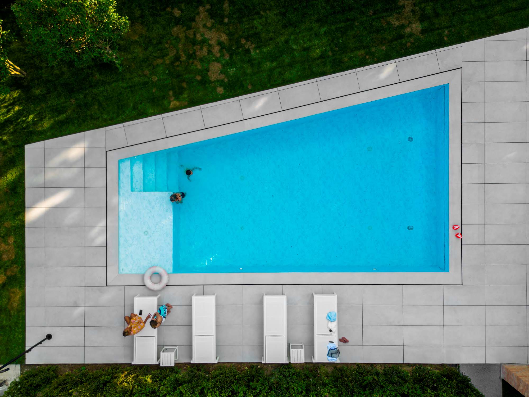 En concreto, para garantizar la coherencia y la funcionalidad, el estudio de arquitectura diseñó, en colaboración con Marazzi, un pavimento flotante de gres porcelánico, utilizado sin solución de continuidad en el patio, la terraza y la zona de la piscina: el resultado es un proyecto de aspecto muy depurado que realza la especial composición planimétrica de la villa. La ventaja del pavimento flotante sobreelevado es que crea un espacio técnico debajo de la superficie en el que se alojan todas las instalaciones, lo que garantiza la máxima capacidad de integración con el entorno y una gran flexibilidad en la distribución de las instalaciones.