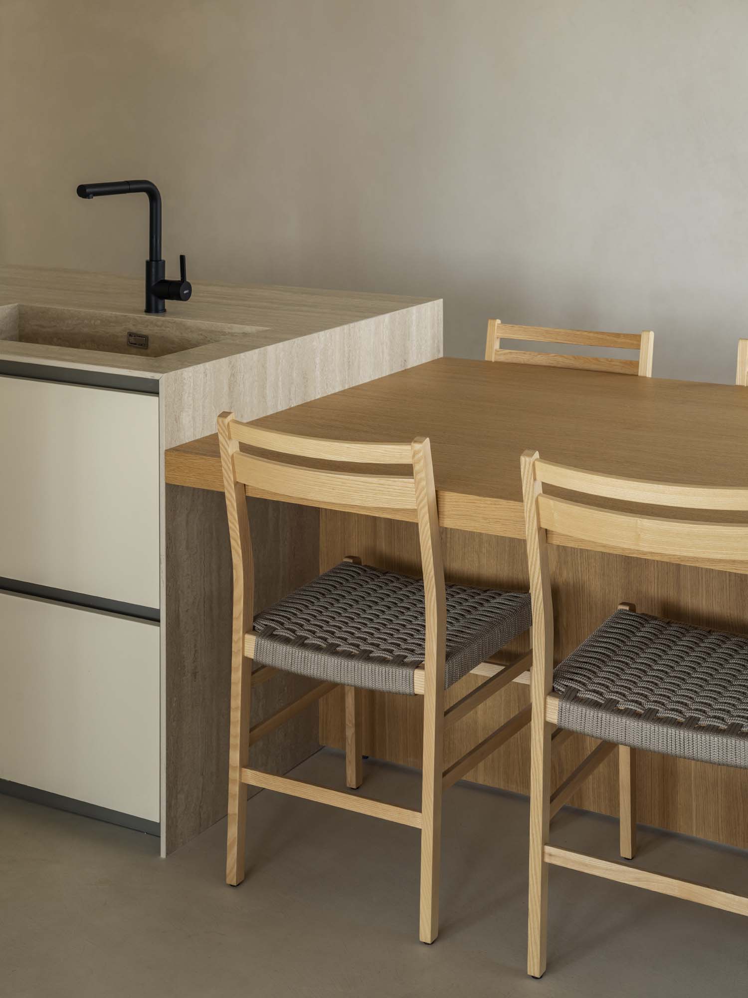 La cocina representa el centro neurálgico de la vivienda y el espacio donde la cerámica se erige como la protagonista. La encimera y el revestimiento del nicho han sido realizados con losas The Top Stone Look en acabado Travertino Classico, elección que permite interpretar la calidez y naturalidad de la piedra junto con la resistencia y practicidad del gres de gran formato. Este material aporta un lenguaje matérico elegante y armonioso, en diálogo con los acabados en madera natural y los demás elementos del interiorismo.