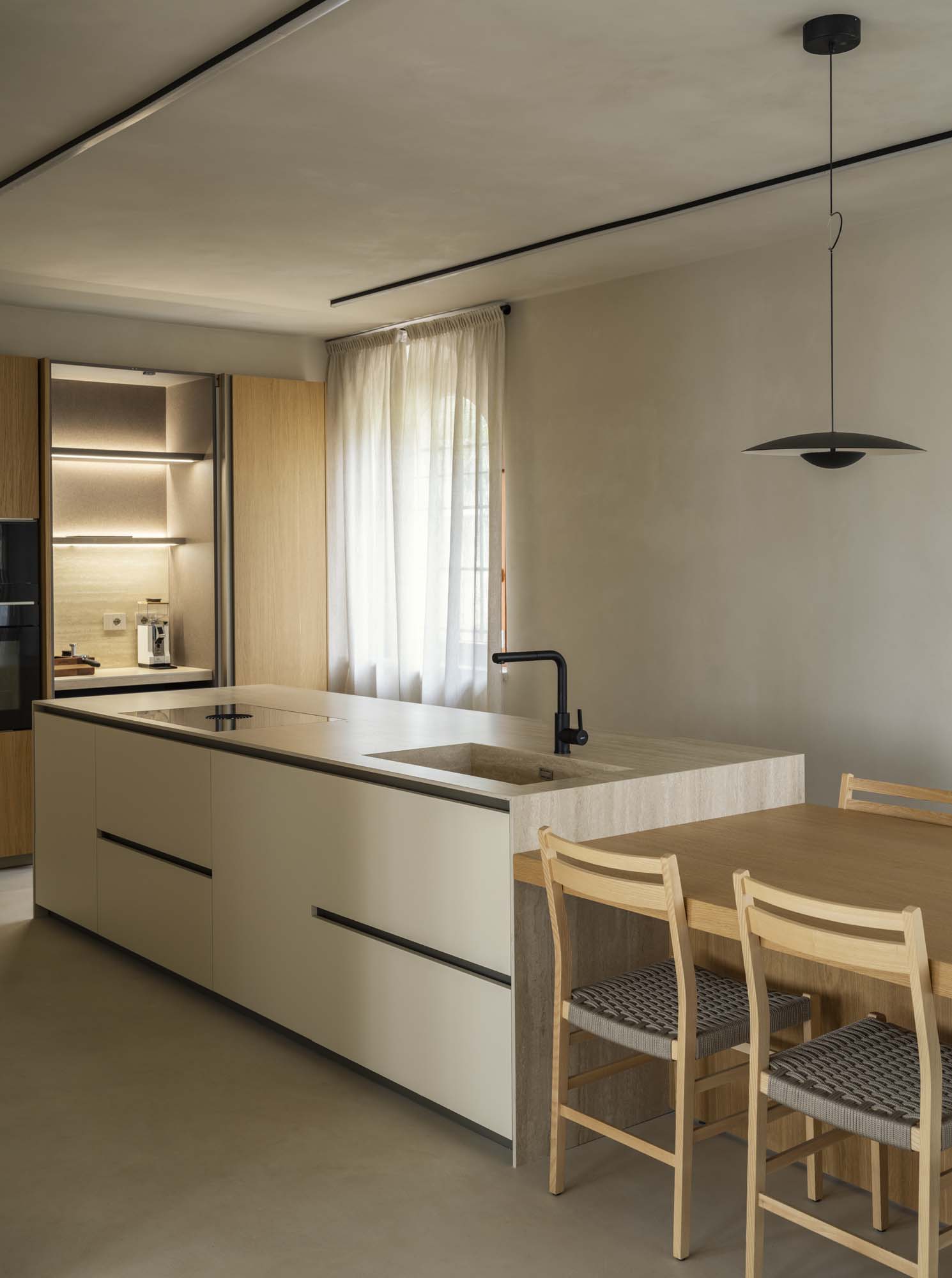 «Utilizamos la cerámica con mucha frecuencia», precisa Elena Tomlenova, directora artística del proyecto, «tanto en nuestros proyectos residenciales como en aquellos de hospitality». Es un material que combina cualidades estéticas y funcionales: permite interpretar estilos diversos gracias a las múltiples terminaciones disponibles, es sumamente duradero y práctico en el mantenimiento, además de garantizar excelentes prestaciones en términos de sostenibilidad. La colección The Top en acabado travertino nos ha permitido conjugar el calor de la piedra con las ventajas técnicas de la cerámica, creando una atmósfera acogedora y sofisticada, en perfecta armonía con toda la villa.»