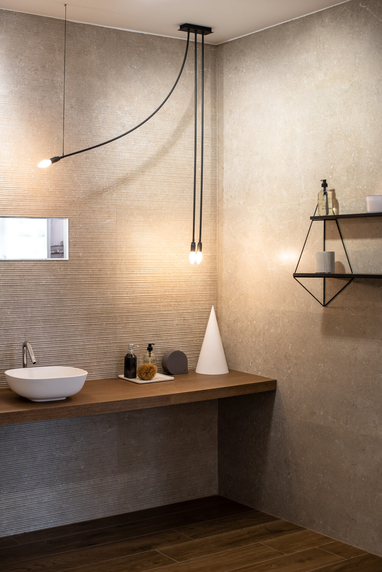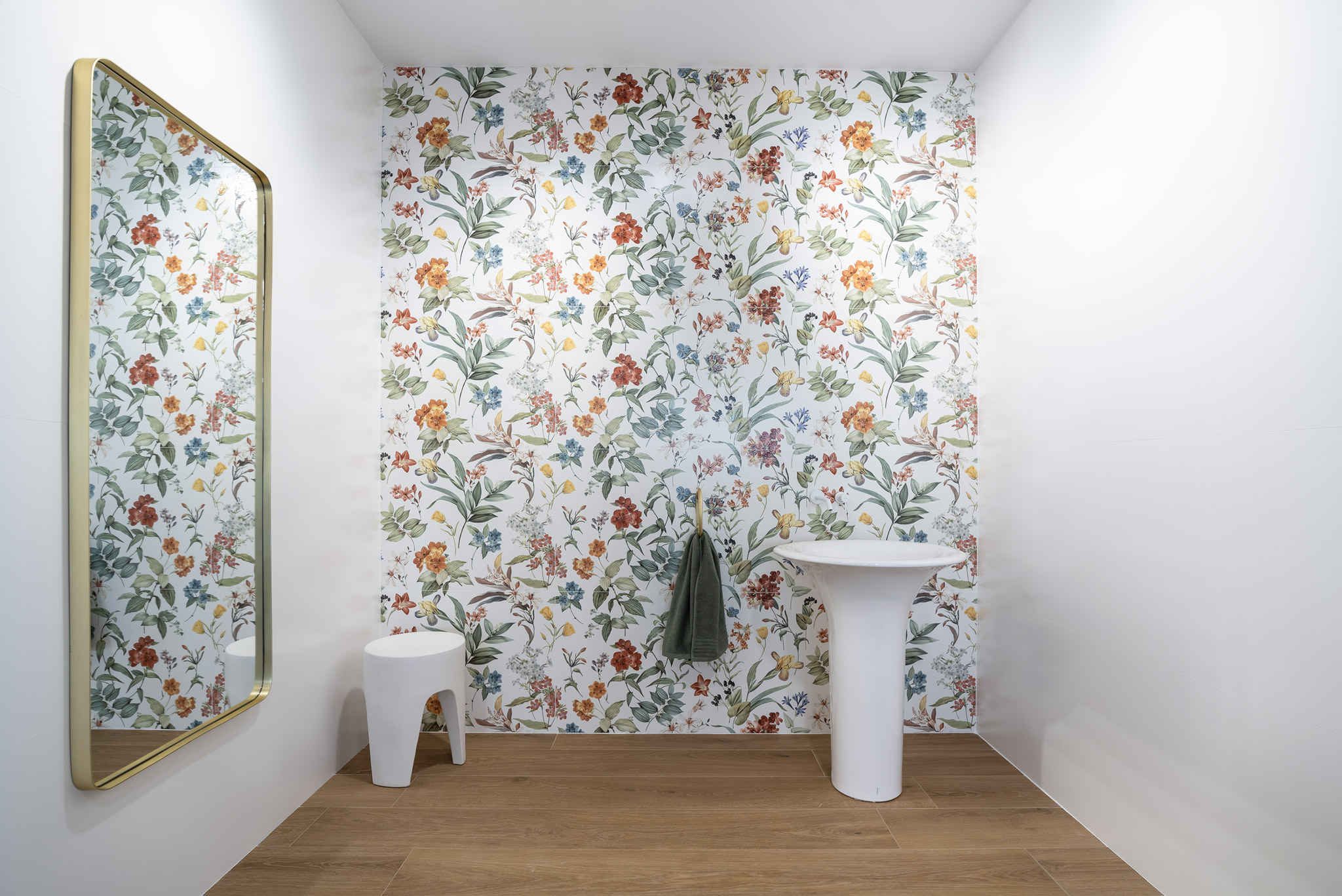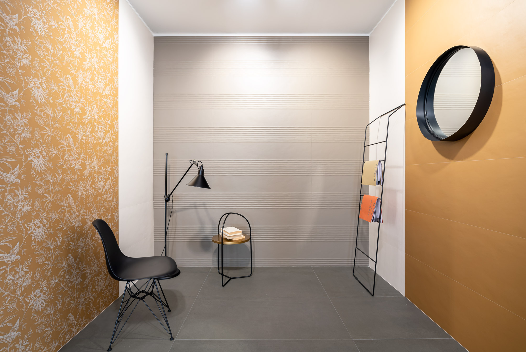 En la planta de arriba, en cambio, la atención se centra en el universo de los revestimientos de espesor reducido y normal, azulejos que recuerdan a las mayólicas tradicionales, en formato muy grande de hasta 60×180, monocolores, con efectos tridimensionales, decoraciones geométricas, florales o isnpirados en papel pintado. Los ambientes realizados permiten apreciar la oferta completa de Marazzi, que es capaz de ofrecer respuestas ante cualquier exigencia de diseño, incluso en términos de sostenibilidad.