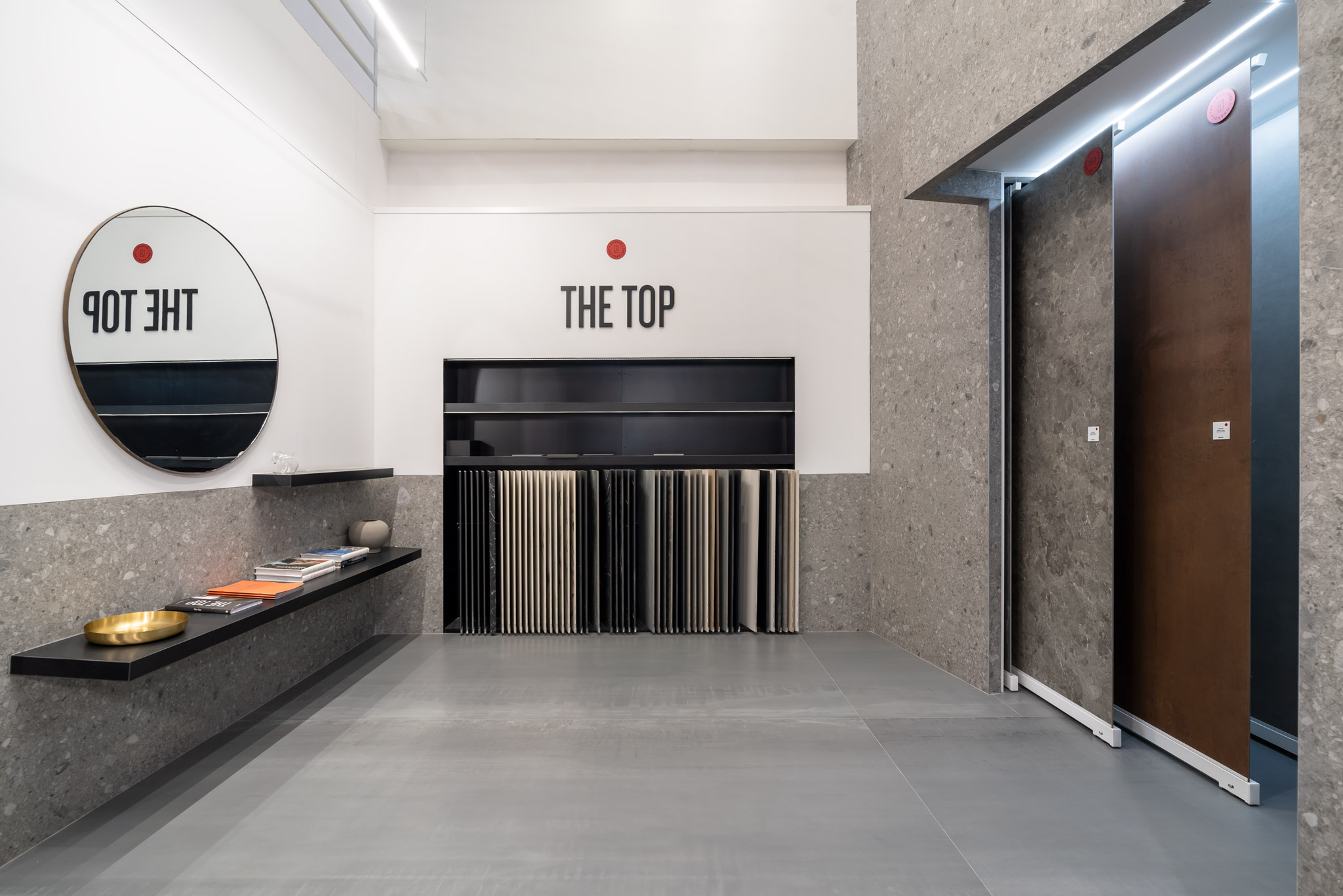 La planta baja presenta las últimas colecciones de gres de Marazzi para interiores y exteriores, en sus distintos efectos inspirados en materiales como mármol, madera, piedra y cemento; el contenedor de formatos pequeños Crogiolo; materiales de estilo artesanal, caracterizados por las imperfecciones y los cromatismos marcados; y la amplia gama de placas de gres porcelánico Grande y The Top en distintos grosores (6, 12 y 20 mm), no solo para superficies horizontales y verticales, sino también para encimeras de cocina y baño, mobiliario como mesas y decoración.