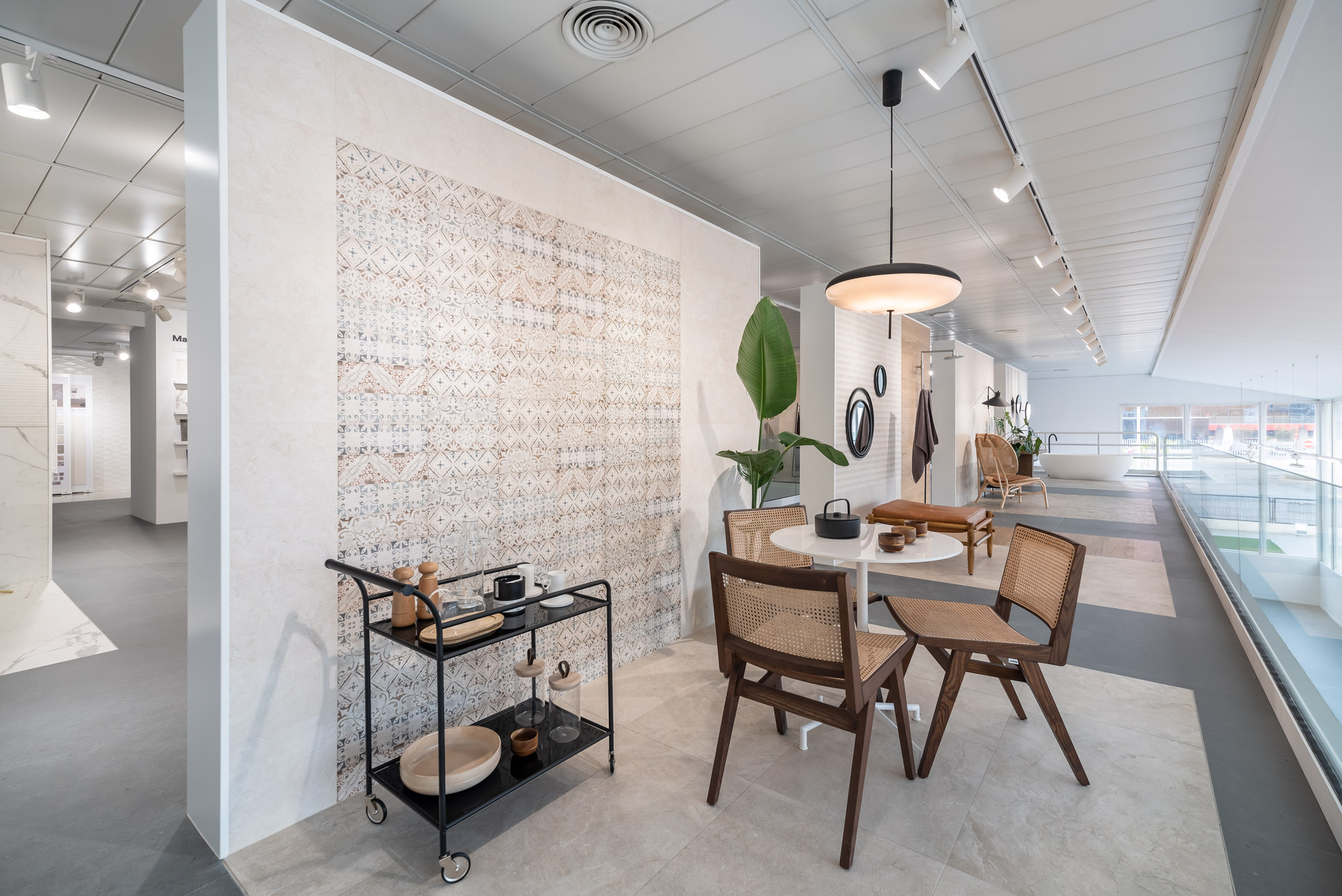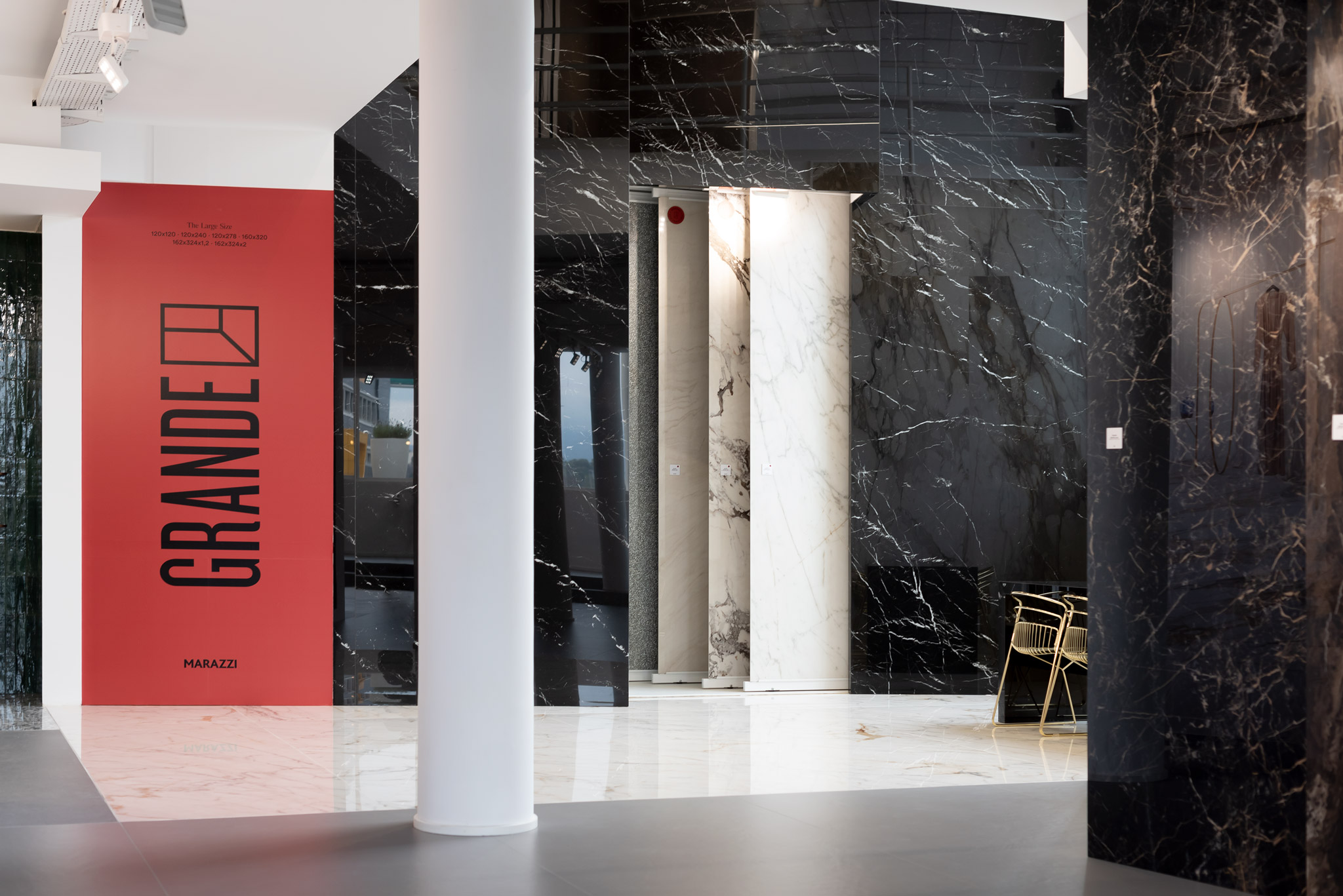 El espacio de más de 1000 m² se distribuye en dos niveles y proporciona a los visitantes una idea de los materiales de primera calidad y de la creatividad a la vanguardia de la marca, con una excelente representación de la amplia y exclusiva oferta de Marazzi, así como de su aptitud para la I+D y la innovación.