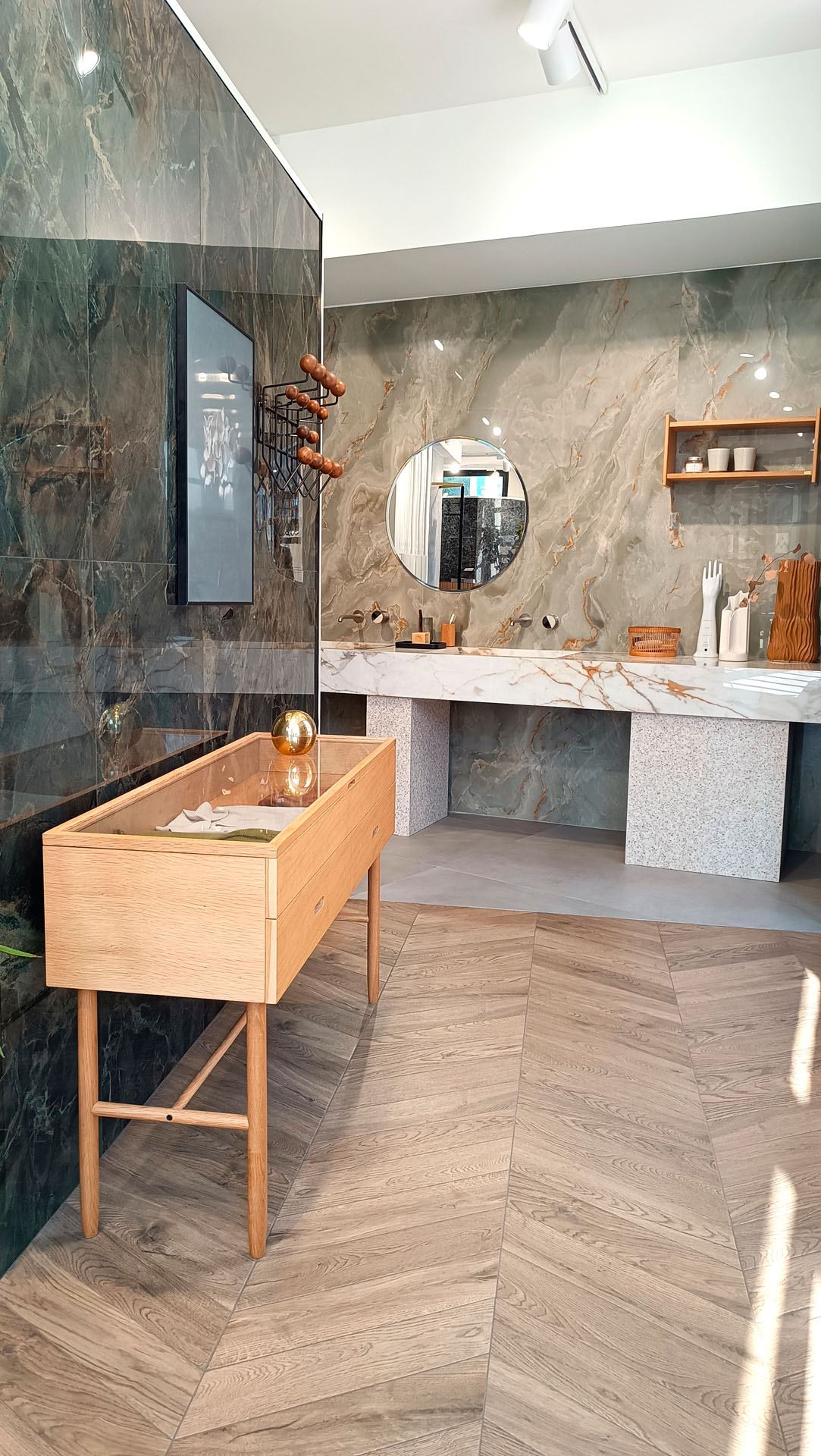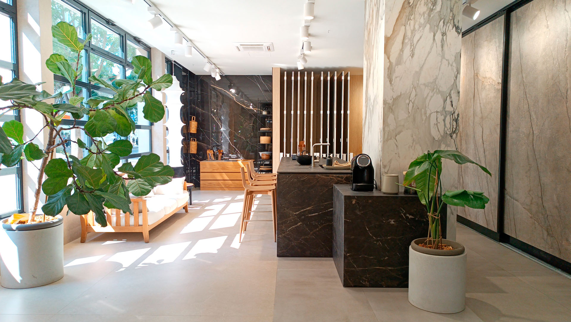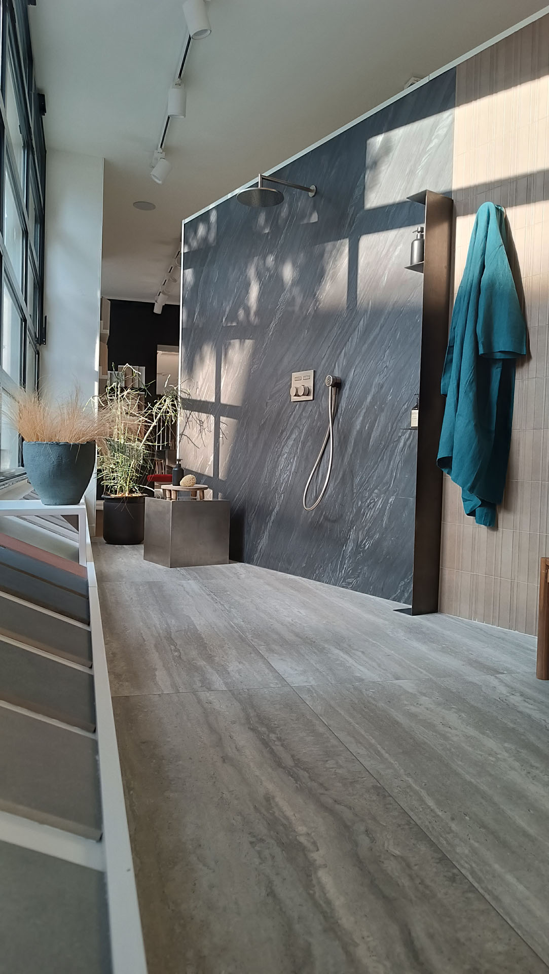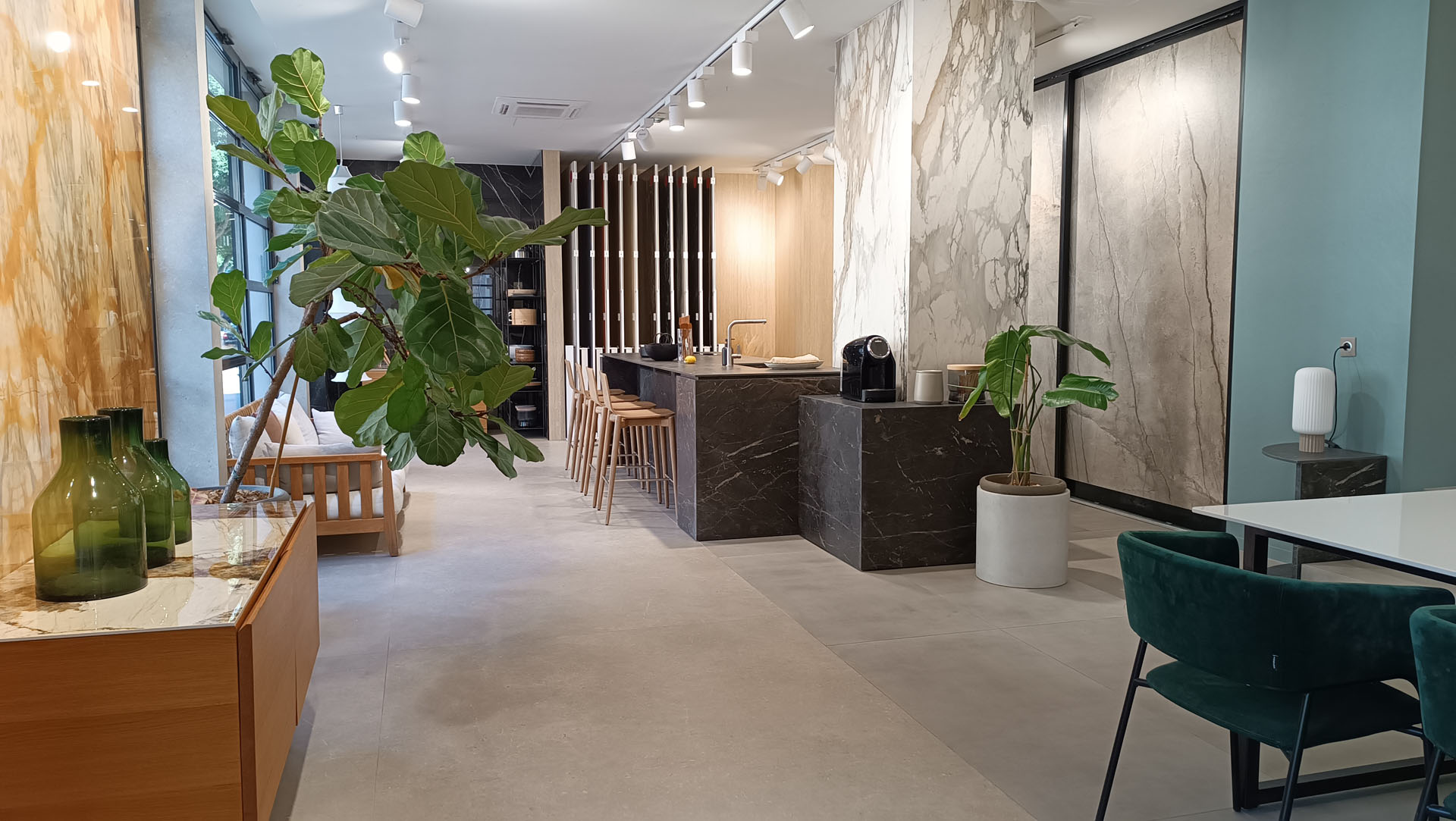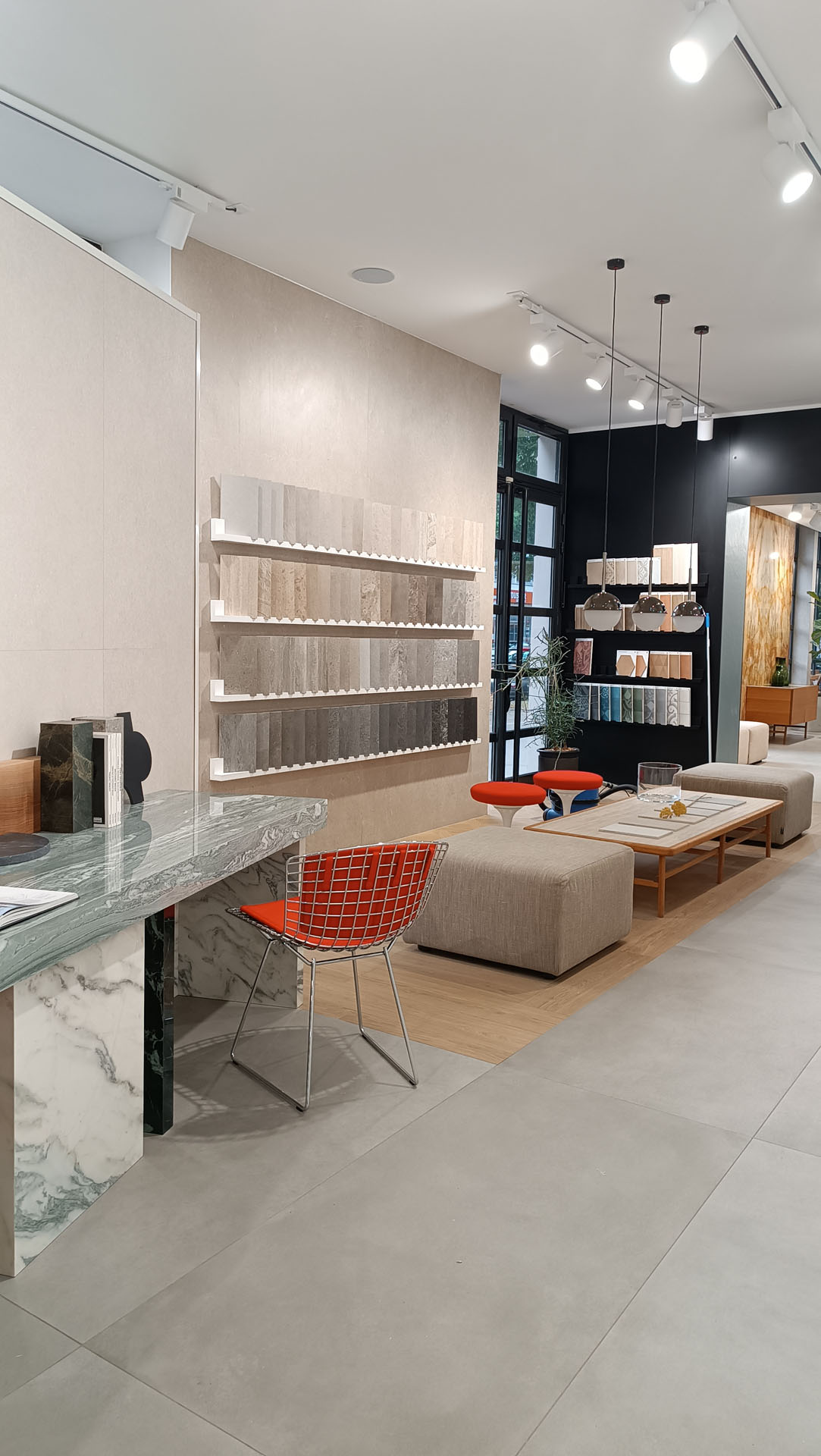 Más de cuatrocientos metros cuadrados con una amplia superficie dedicada a las placas de gres de formato extragrande, entre las que se encuentra la selección de The Top destinada a encimeras, salpicaderos, mesas, hojas de puertas y soluciones de decoración personalizadas para ámbitos residenciales y comerciales. También se halla disponible un generoso surtido de productos fabricados con gres porcelánico, de monococción y mosaico en varios formatos, colores, grosores y superficies, así como un espacio exterior con los pavimentos de gres técnico de grosor aumentado, tanto para el hogar como para el contract.