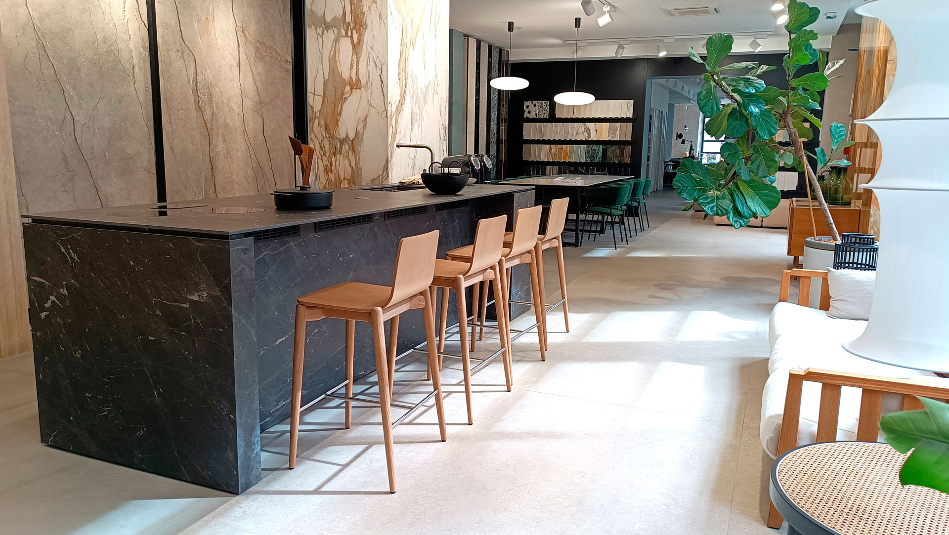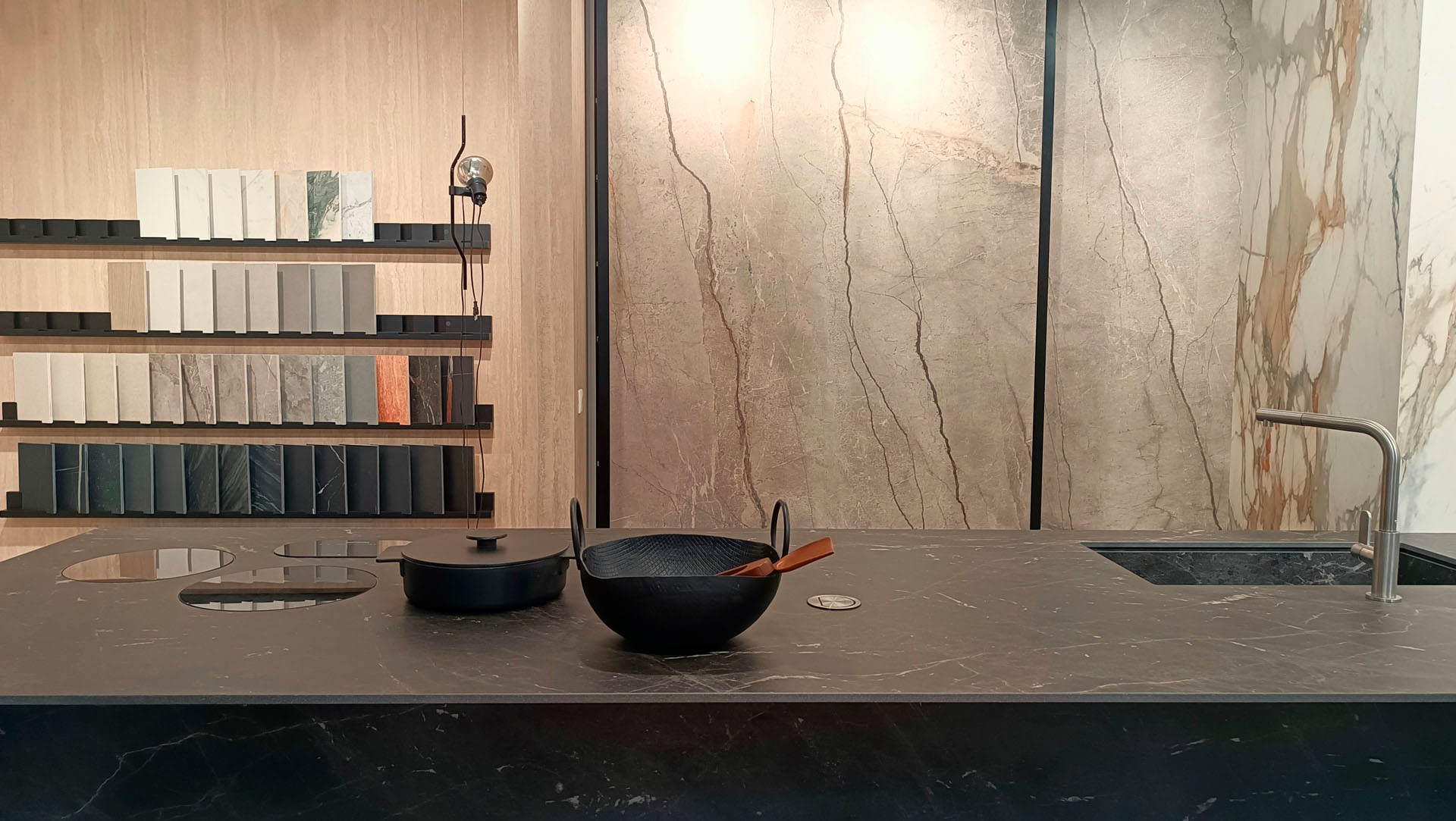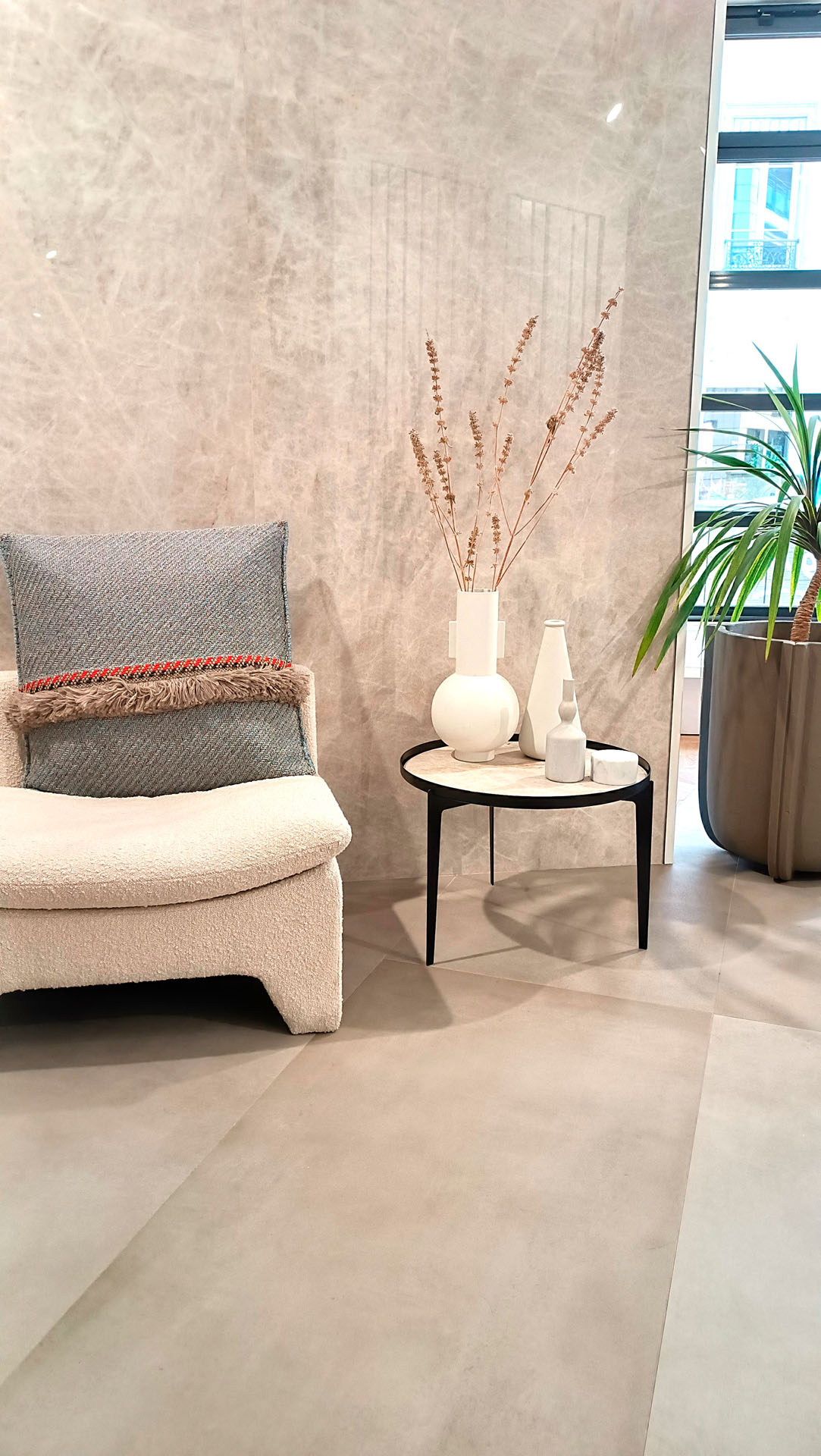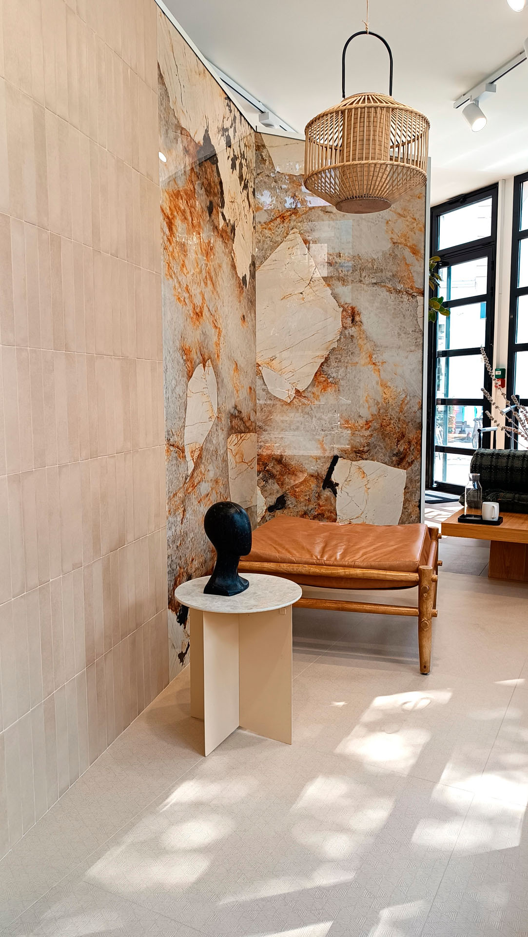 Más de cuatrocientos metros cuadrados con una amplia superficie dedicada a las placas de gres de formato extragrande, entre las que se encuentra la selección de The Top destinada a encimeras, salpicaderos, mesas, hojas de puertas y soluciones de decoración personalizadas para ámbitos residenciales y comerciales. También se halla disponible un generoso surtido de productos fabricados con gres porcelánico, de monococción y mosaico en varios formatos, colores, grosores y superficies, así como un espacio exterior con los pavimentos de gres técnico de grosor aumentado, tanto para el hogar como para el contract.