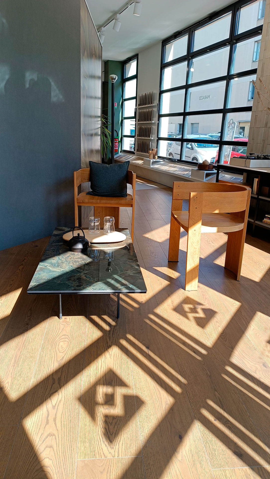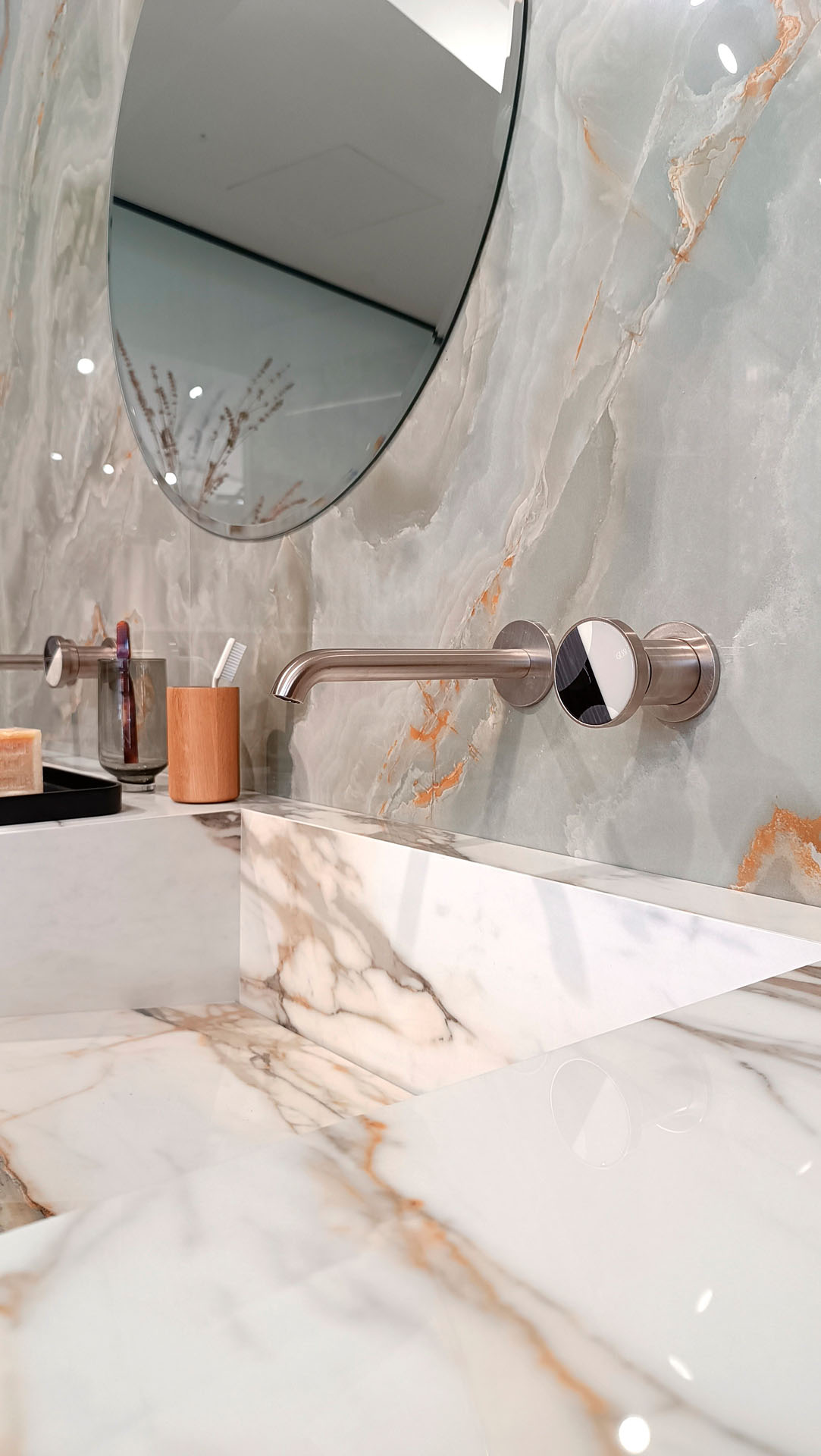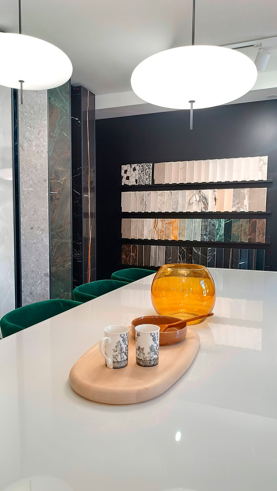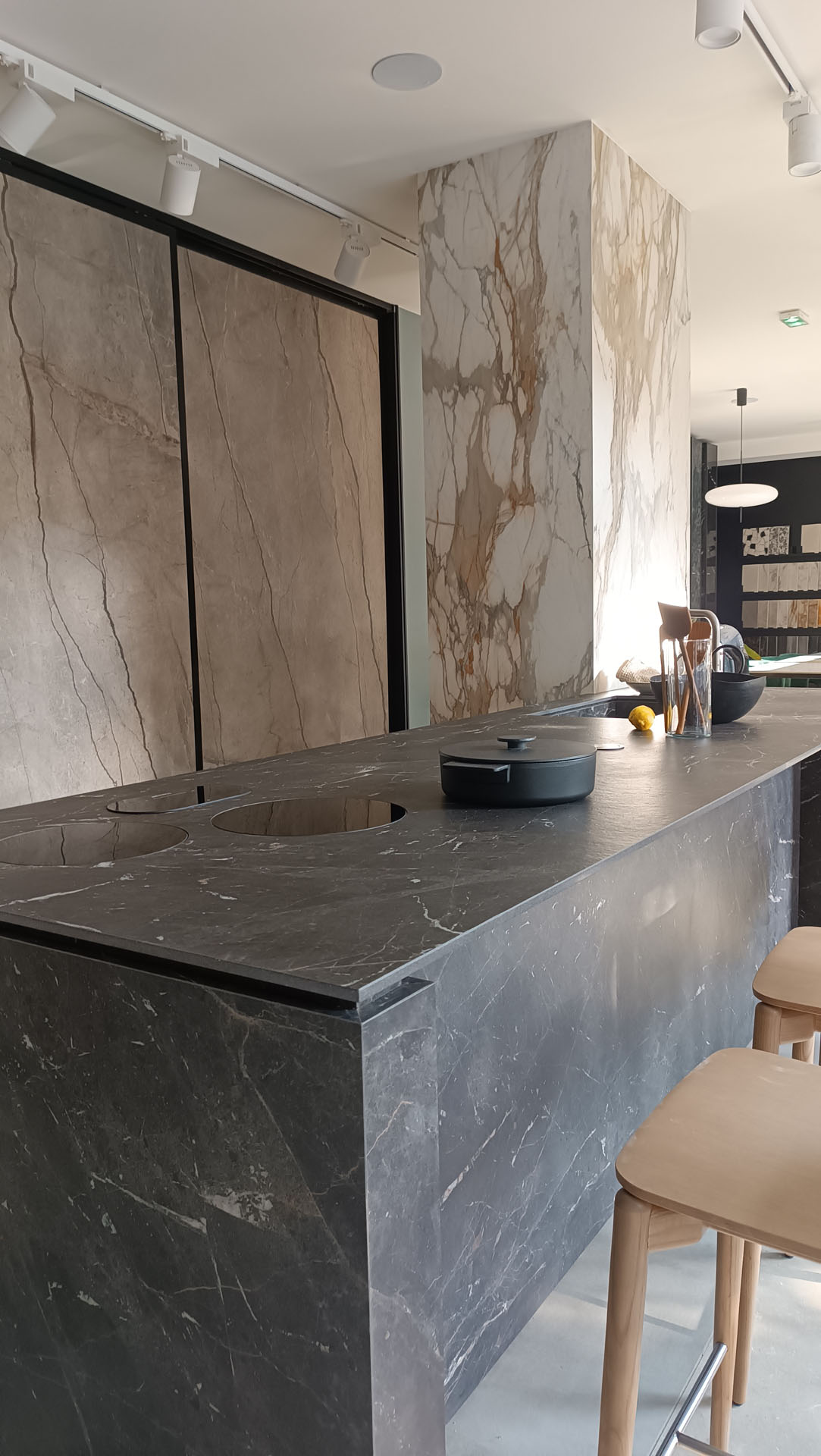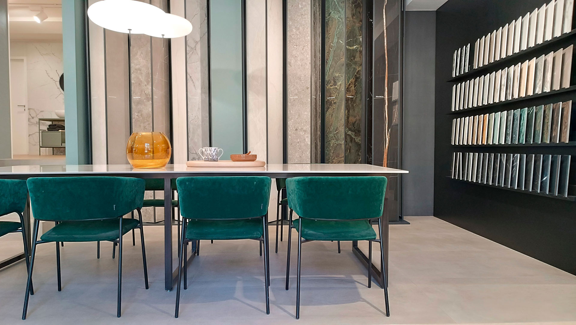 Más de cuatrocientos metros cuadrados con una amplia superficie dedicada a las placas de gres de formato extragrande, entre las que se encuentra la selección de The Top destinada a encimeras, salpicaderos, mesas, hojas de puertas y soluciones de decoración personalizadas para ámbitos residenciales y comerciales. También se halla disponible un generoso surtido de productos fabricados con gres porcelánico, de monococción y mosaico en varios formatos, colores, grosores y superficies, así como un espacio exterior con los pavimentos de gres técnico de grosor aumentado, tanto para el hogar como para el contract.